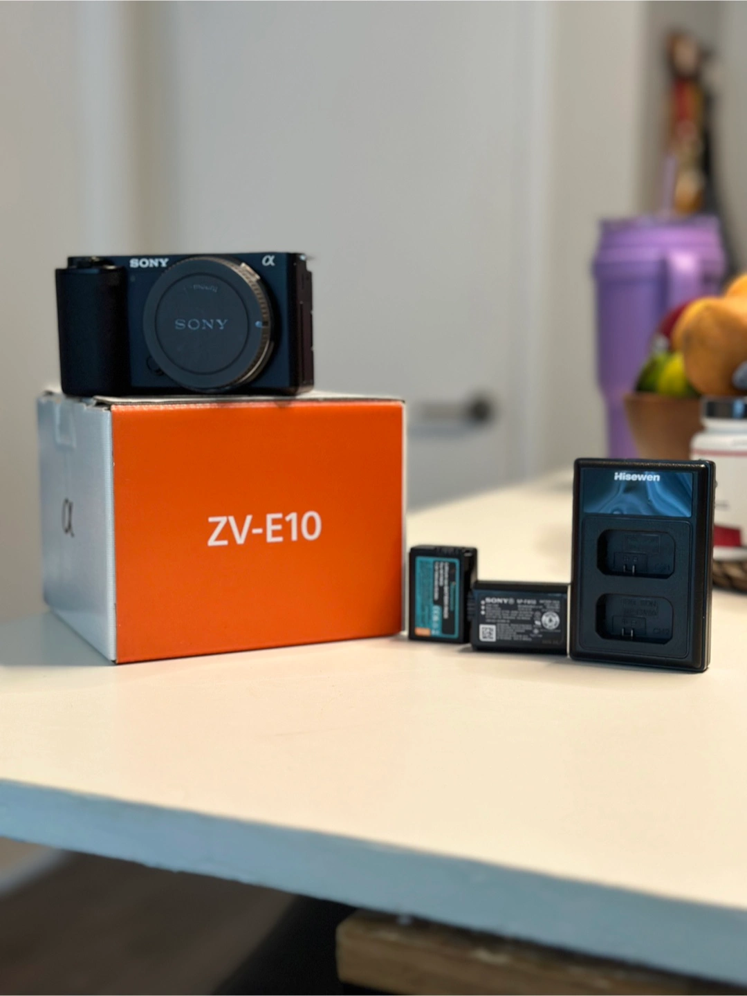 Selling a Sony ZV-E10 camera in great condition! The shutter count is 1251. It comes with its original box and a Hisewen charger