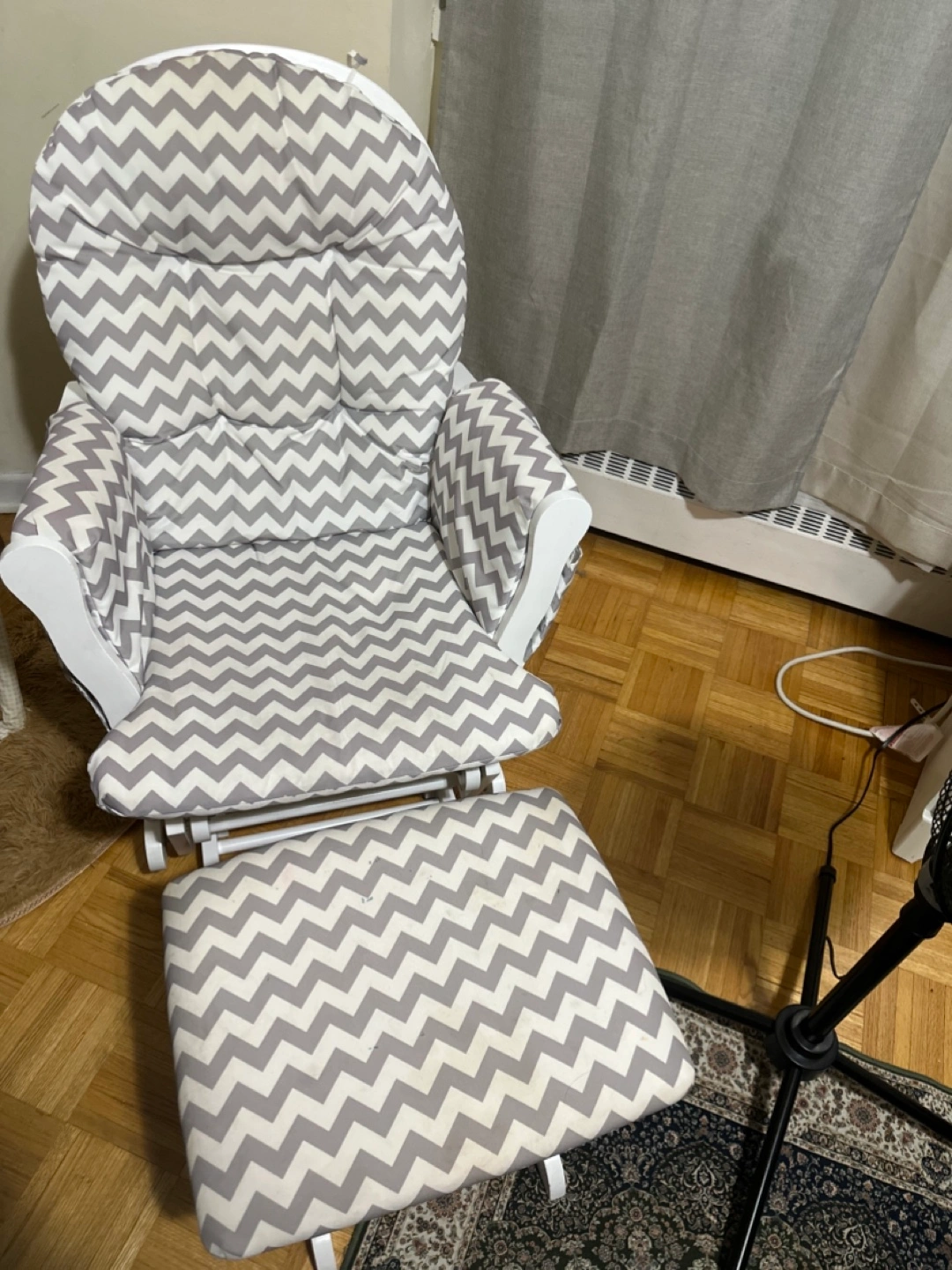 Selling a comfy glider rocking chair with a matching ottoman! The chair and ottoman have a white frame and grey and white chevron patterned cushions. Perfect for a nursery or any cozy corner in your home