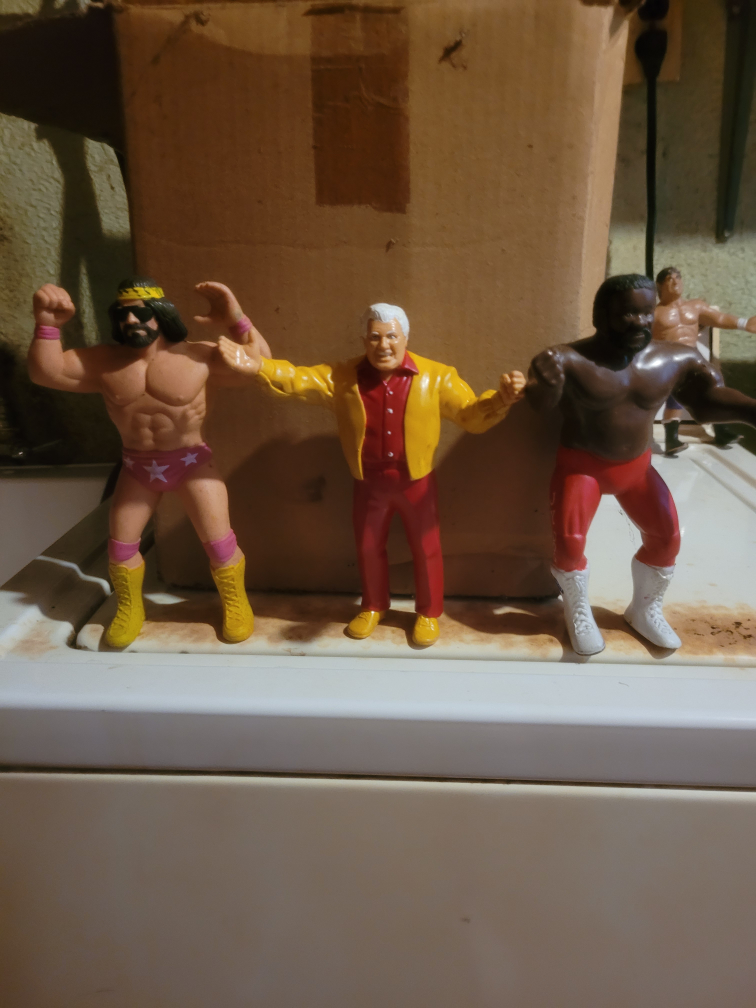 Selling a set of vintage wrestling action figures. They show some signs of wear, but are still in good condition for their age. Great for collectors or fans of classic wrestling!
