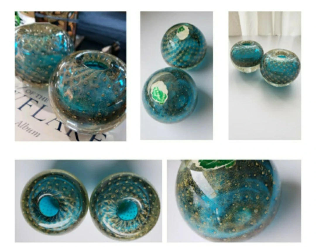 These Murano glass candle holders have a beautiful teal and gold swirl design. They add a touch of elegance to any space! Controlled bubbles.