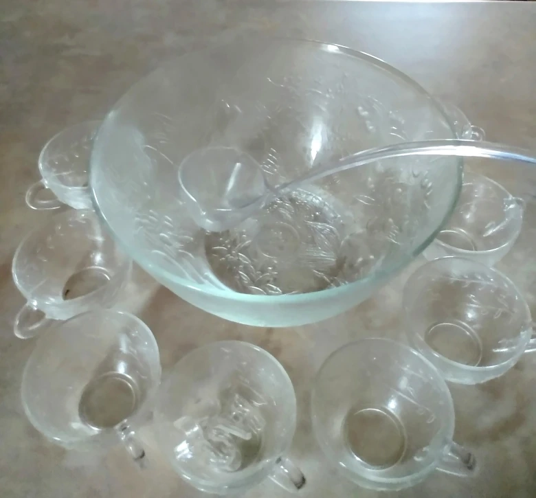 Selling a beautiful vintage glass punch bowl set! It includes the large punch bowl, several matching cups, and a ladle. The set features a delicate floral pattern etched into the glass, adding a touch of elegance to any gathering. Perfect for parties or special occasions!
