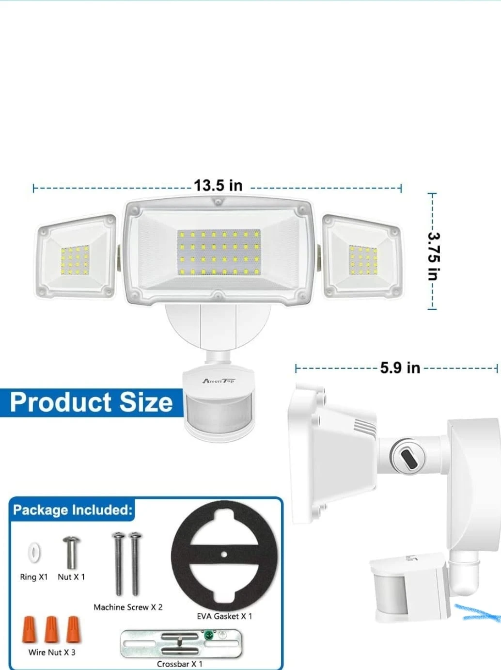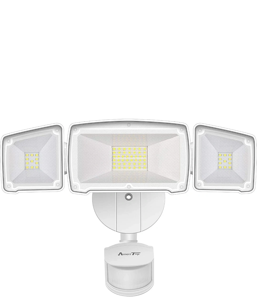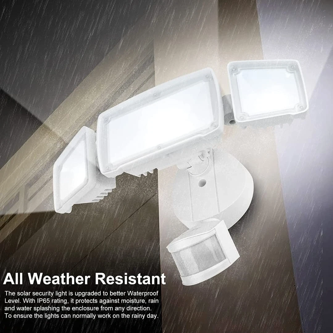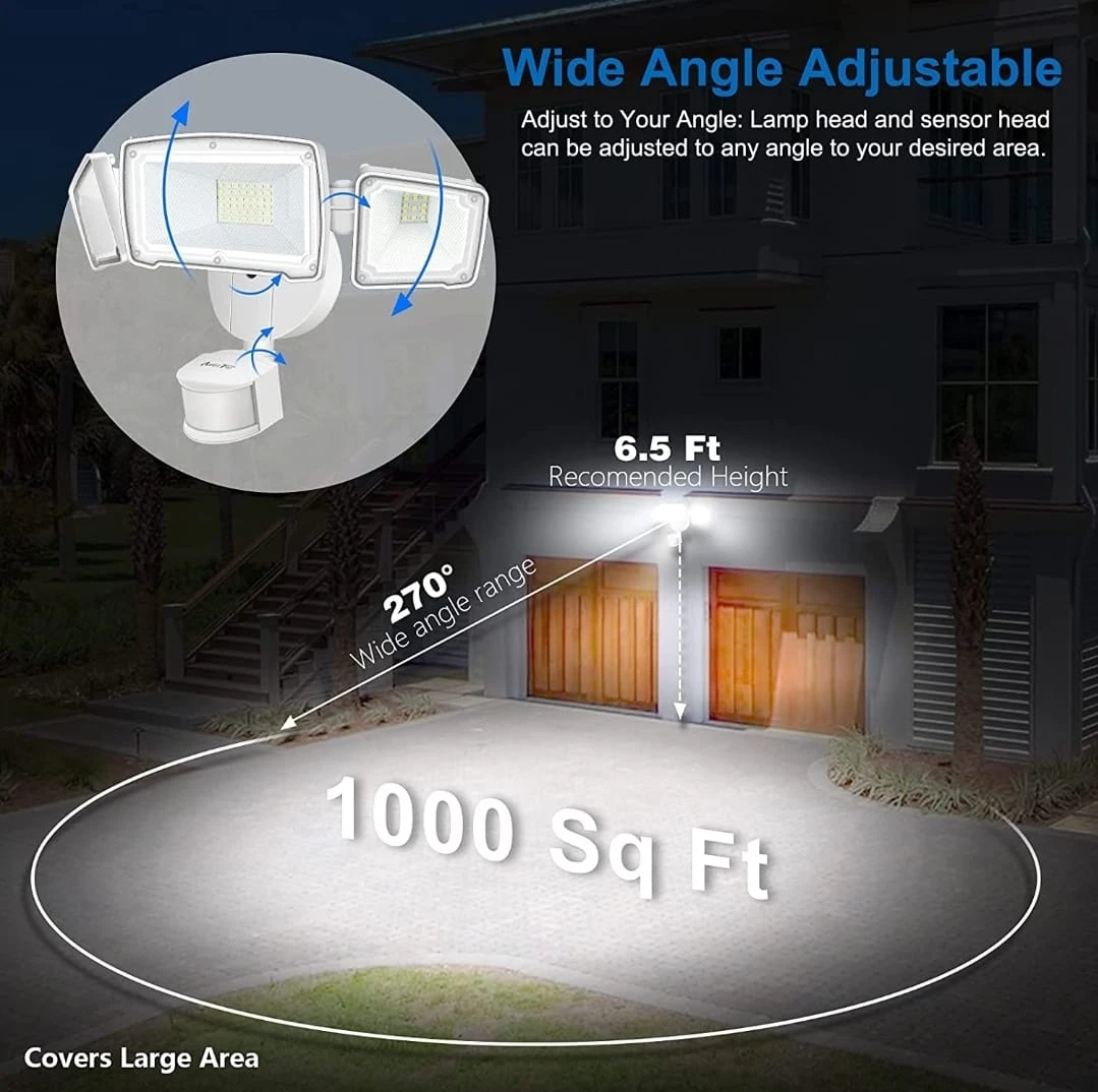 390Motion Sensor AUTO Mode - Our lights have daylight and motion sensor, the motion is detected with 180 degrees swiveling angle, sensing light levels and motion up to max 72 feet. Auto ON for pre-determined time(1/5/10MIN) when people or other living objects are detected within the sensing area, and Auto OFF after no further motion is detected. Built-in PIR motion sensor of our outdoor lights, it has a long-range of distance and a wide-angle for motion detection. Photocell Light Sensor Mode - Dusk to Dawn Mode, at dusk, the light will turn on at 50% brightness as an accent light. When motion is detected the light illuminates at 100% brightness 3H/6H Mode, at dusk, the light will turn on at 50% brightness as an accent light. When motion is detected the light illuminates at 100% brightness. The light will operate like this for 3/6 hours. After 3/6 hours the light becomes just a motion light. Ultra Bright & Energy Saving - ETL-Certification guarantees premium quality and lighting performance. The AmeriTop motion sensor security light with the three heads design, output 35W, 3500 Lumens, 6000K high brightness output, and good heat dissipation. Equivalent to 200W halogen light, also save your electricity bill by more than 80%. Lighting direction is adjustable with the three flexible light heads, save your trouble to install two extra light. Security Outdoor Lights - Motion Sensor Mode & Dusk to Dawn Sensor 2 in 1. The robust die-cast aluminum housing and impact-resistant PC lens ensure this 3 head security light fixture can stand up to the elements and bad weather. IP65 waterproof rating ensures that your 3 head security light fixture won't give in in rain, sleet, or snow weather. It's specifically designed to withstand extreme weather conditions, all-weather resistant and provide additional safety and security for your home. Larger Lighting Area - With the innovative wide-angle and three heads design, Adjustable heads can move upwards, downwards and horizontally. The triple head design gives you a much wider light casting range. Adjust light heads to the angles you see fit. Up to 180 Deg wide sensing angle and 60ft sensing distance, easy to adjust the light heads, lens hoods, and motion sensor to different angles as your requirement. This light can be easily installed by following a few simple wiring steps