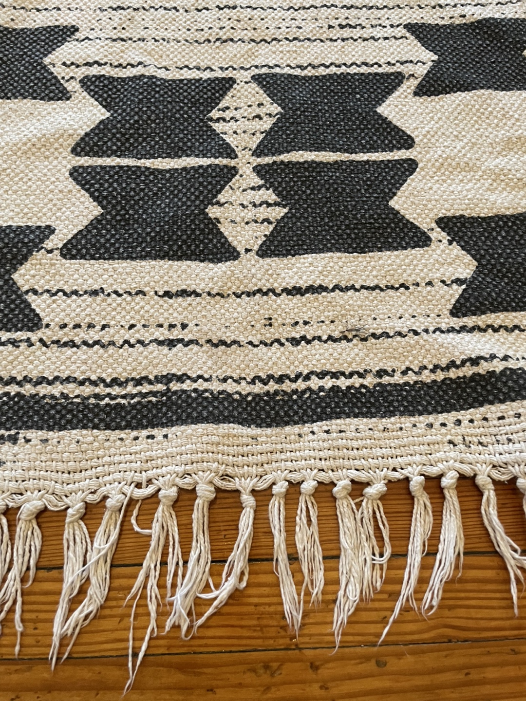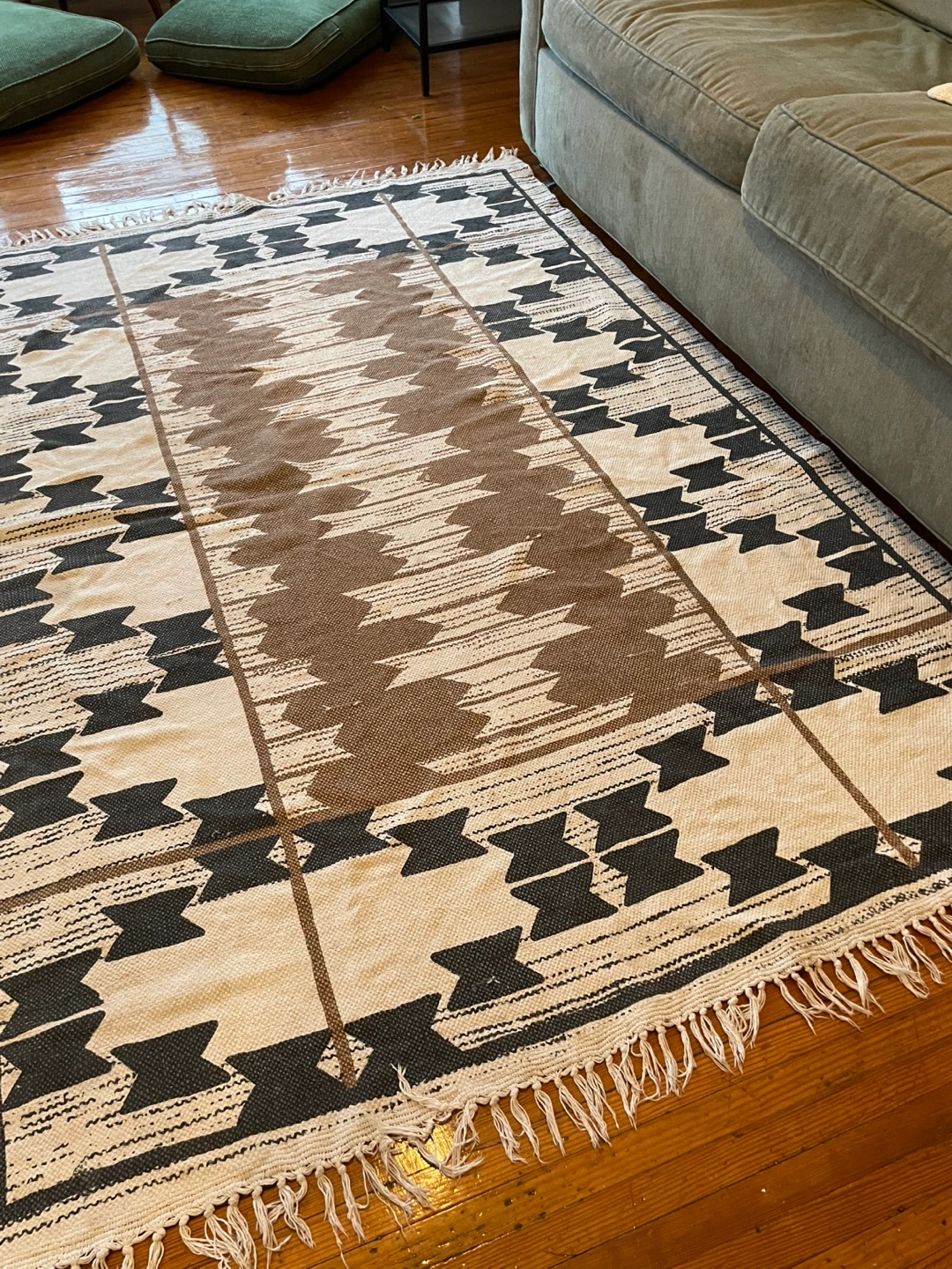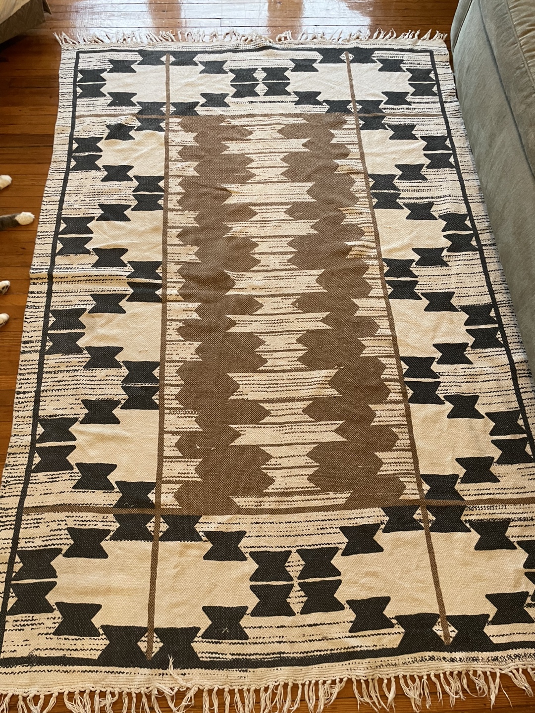 Selling a perfect condition and clean area rug. It features a geometric design in black, brown, and cream colours. It would be great for adding a bit of style to any room!