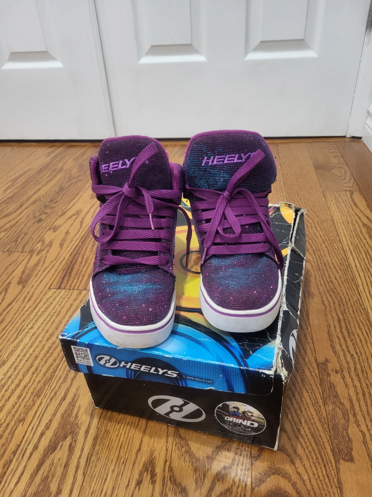 Selling a pair of Heelys roller shoes in purple. They come with the original box! Size is Youth 4 (US).