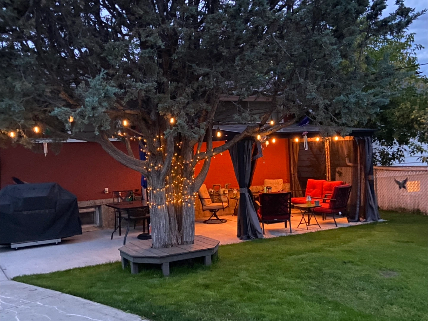 It has grey curtains to go with they are in ok condition will work and function for you for now but all these gazebo eventually need curtains upgraded over time but these still have life left to them