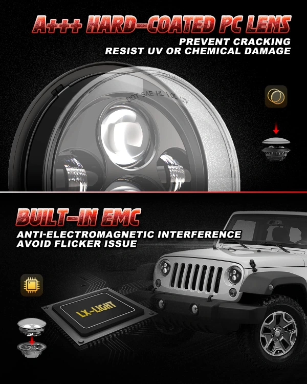 These LX-LIGHT 7 inch LED headlights are a great upgrade for your vehicle! They're designed with a hard-coated PC lens to prevent cracking and resist UV or chemical damage.