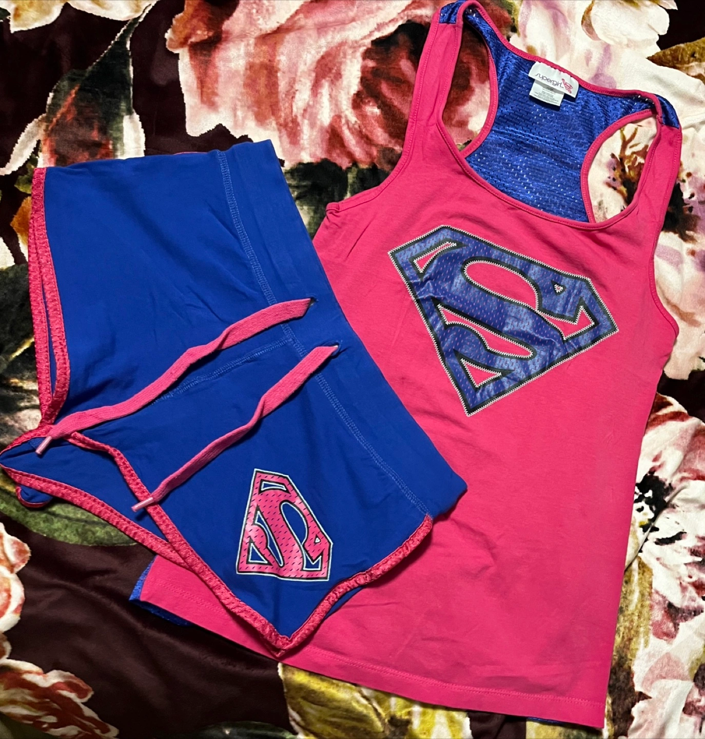 Selling a cute Supergirl tank top and shorts set! The tank top is pink with a blue Supergirl logo, and the shorts are blue with a pink logo.