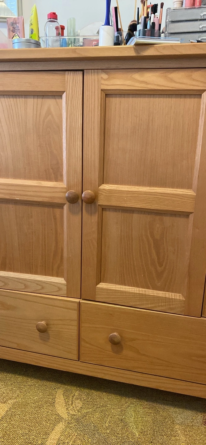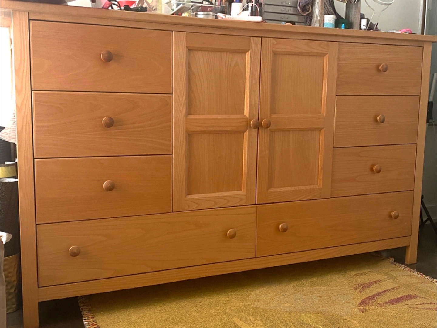 Moving out sale! A lovely pine wood dresser, perfect for adding storage and style to any room! It features a combination of drawers and doors, offering versatile storage options. The wood has a warm, natural tone that would complement a variety of decor styles. It's in great condition.