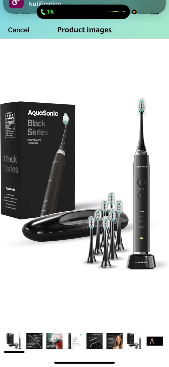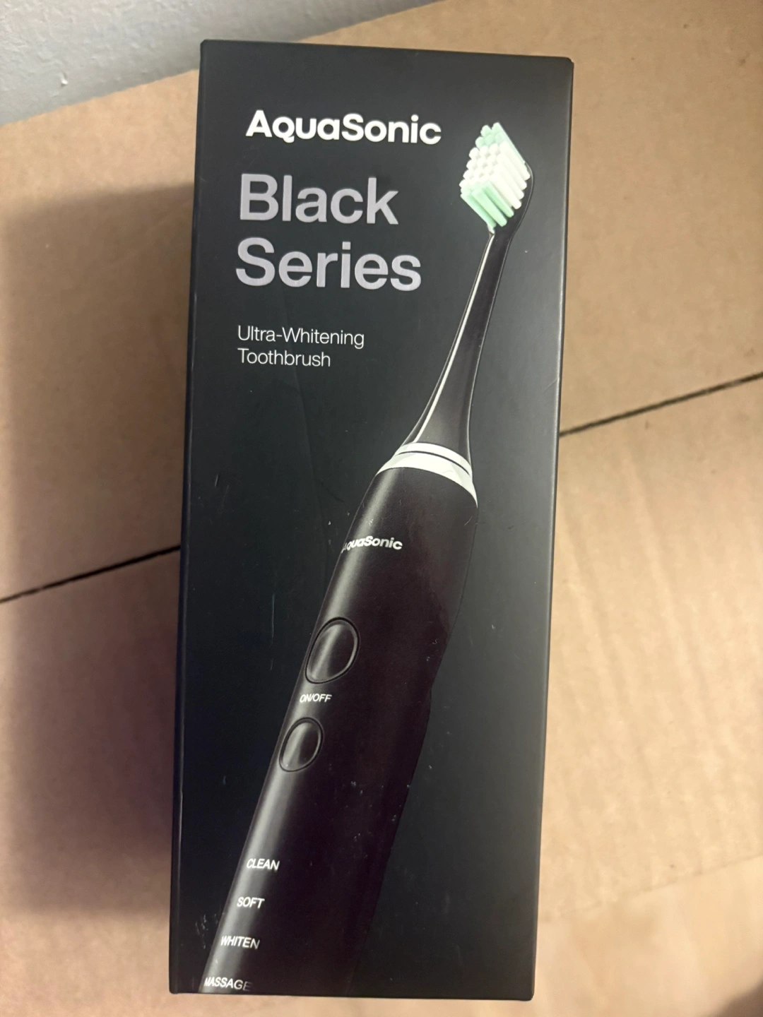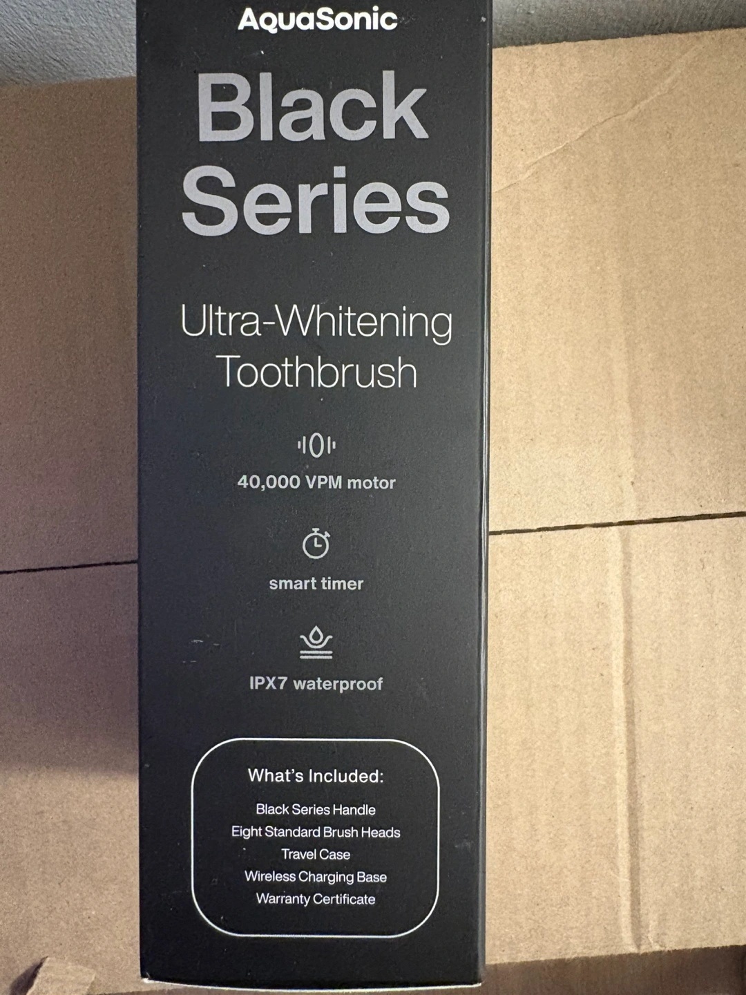 I'm selling an AquaSonic Black Series Ultra-Whitening Toothbrush! It comes with the Black Series handle, eight standard brush heads, a travel case, a wireless charging base, and a warranty certificate The toothbrush has a 40,000 VPM motor, a smart timer, and is IPX7 waterproof