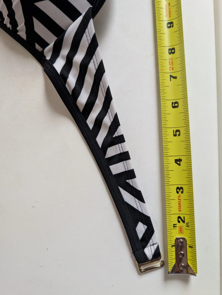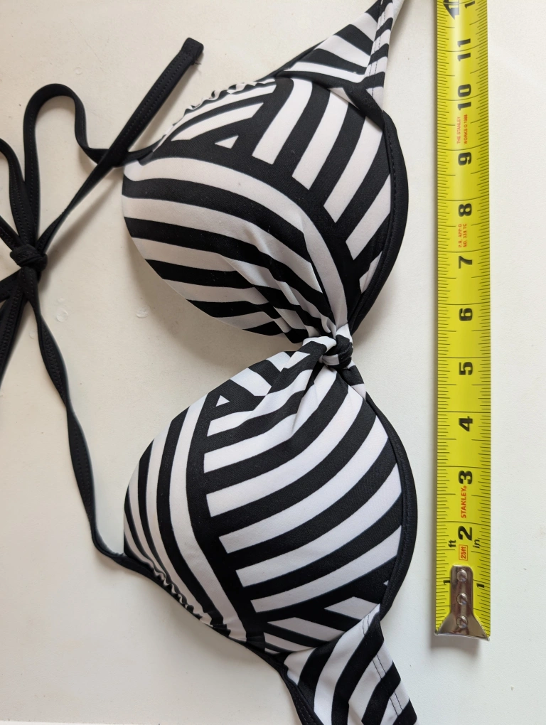 Selling a cute Catalina bikini top in a black and white striped pattern! It's a size M/M and made with 82% nylon and 18% spandex for the shell, and 100% polyester for the lining