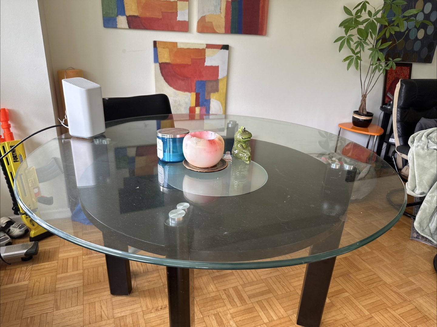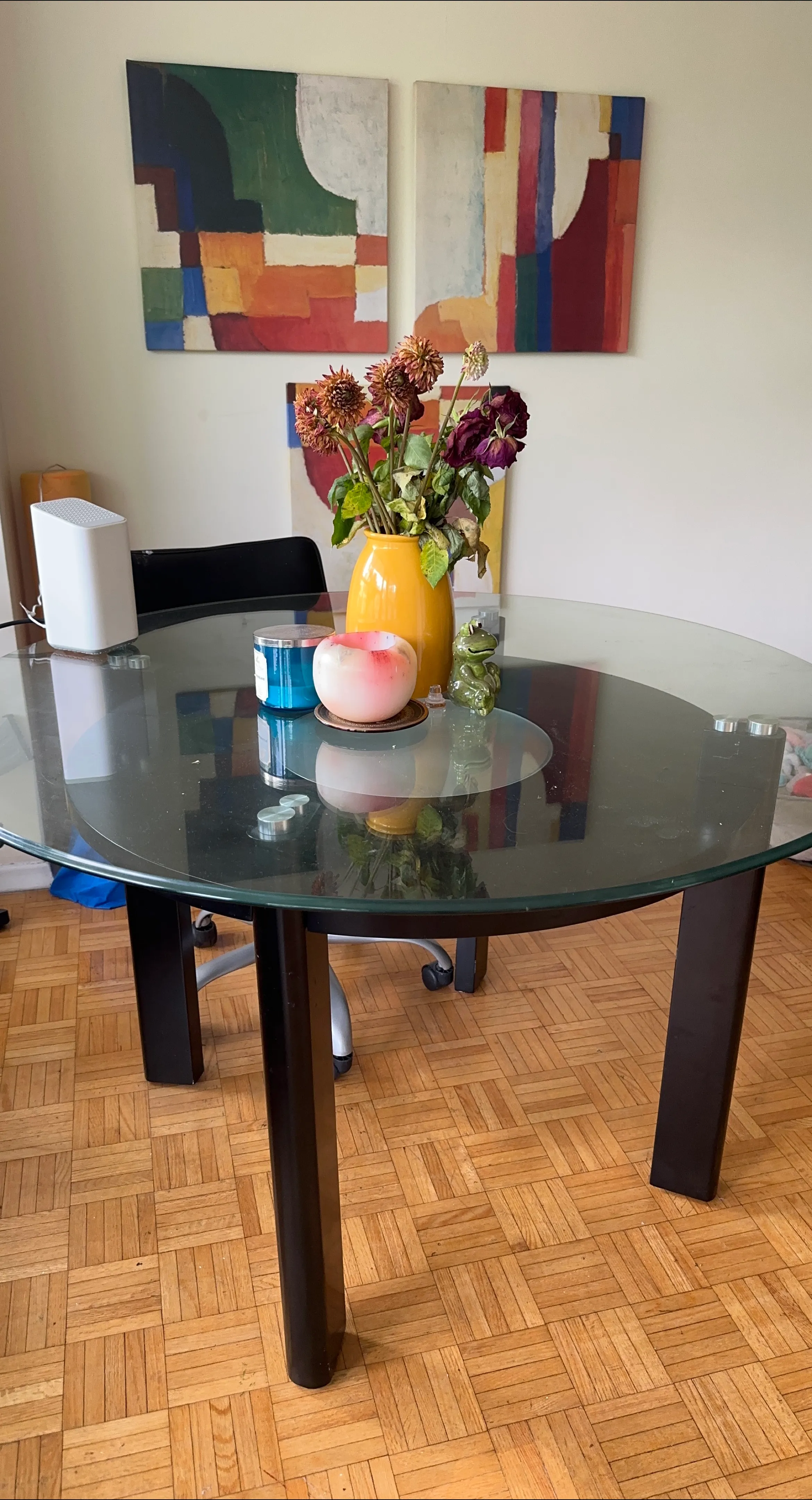 Selling a round glass dining table. It's in good condition and ready for a new home. Perfect for a smaller dining space or kitchen nook!