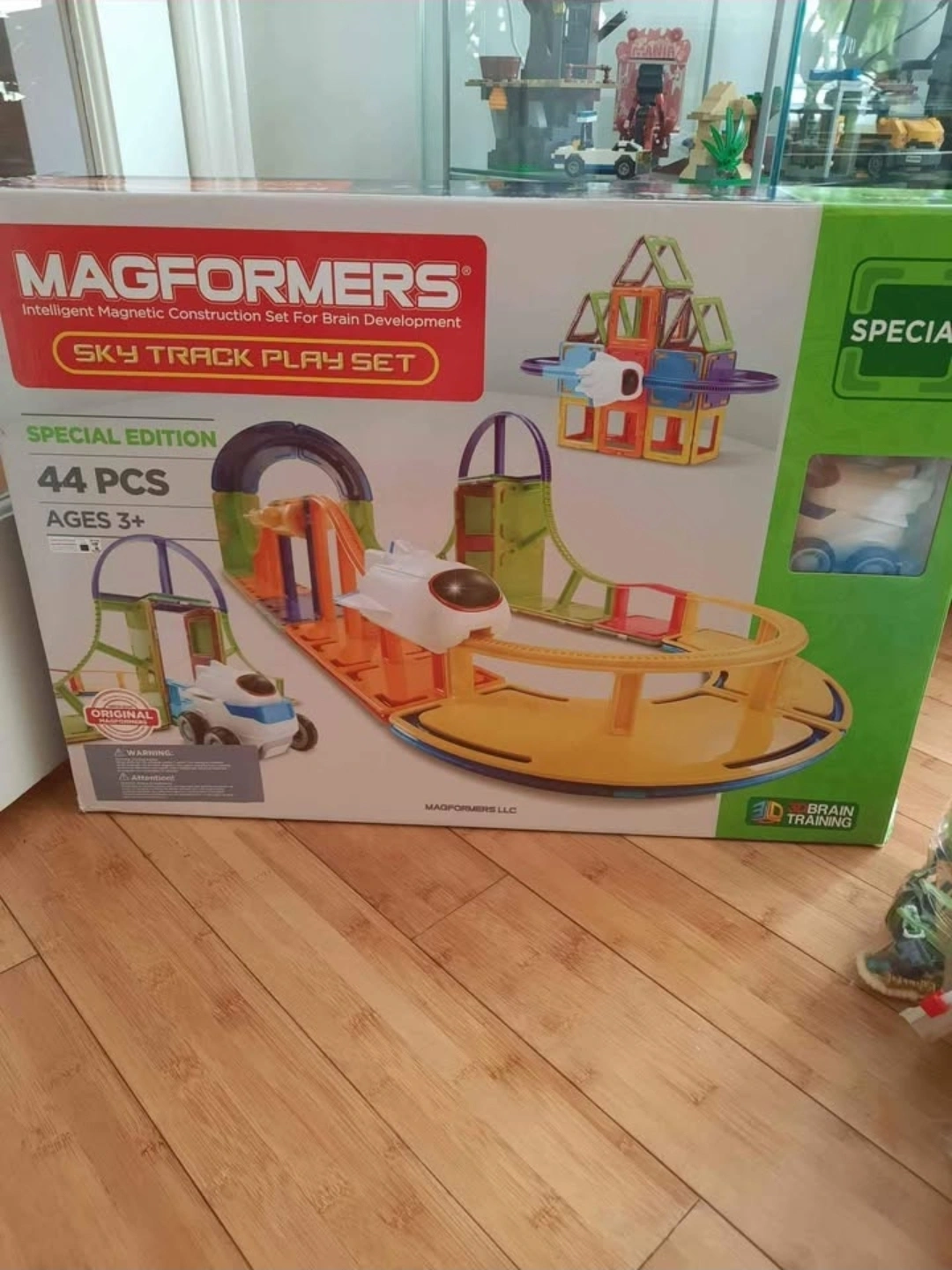 Selling a Magformers Sky Track Play Set! This is a special edition set with 44 pieces, designed for ages 3+. It's an intelligent magnetic construction set perfect for brain development. Get ready for hours of fun!