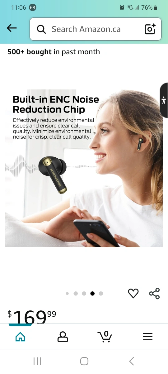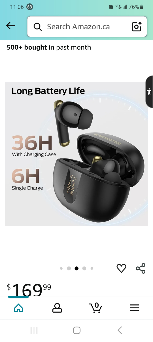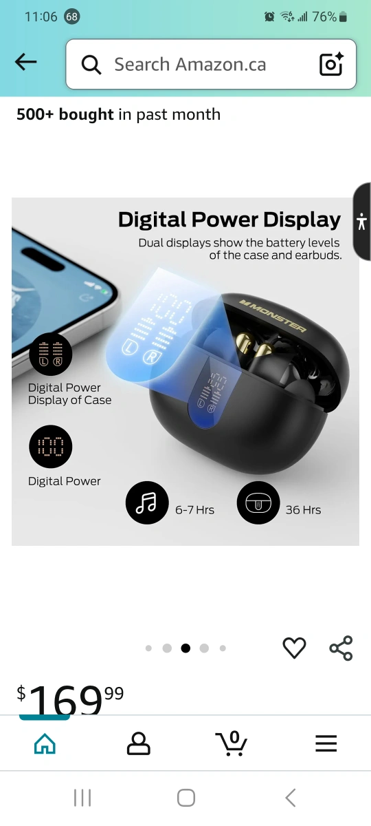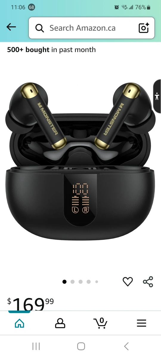Selling a pair of black Monster wireless earbuds. The charging case has a digital power display showing the battery levels of the case and earbuds. It has a long battery life of 36 hours with the charging case and 6 hours on a single charge. Features built-in ENC noise reduction chip for crisp, clear call quality. Originally bought for $169.99