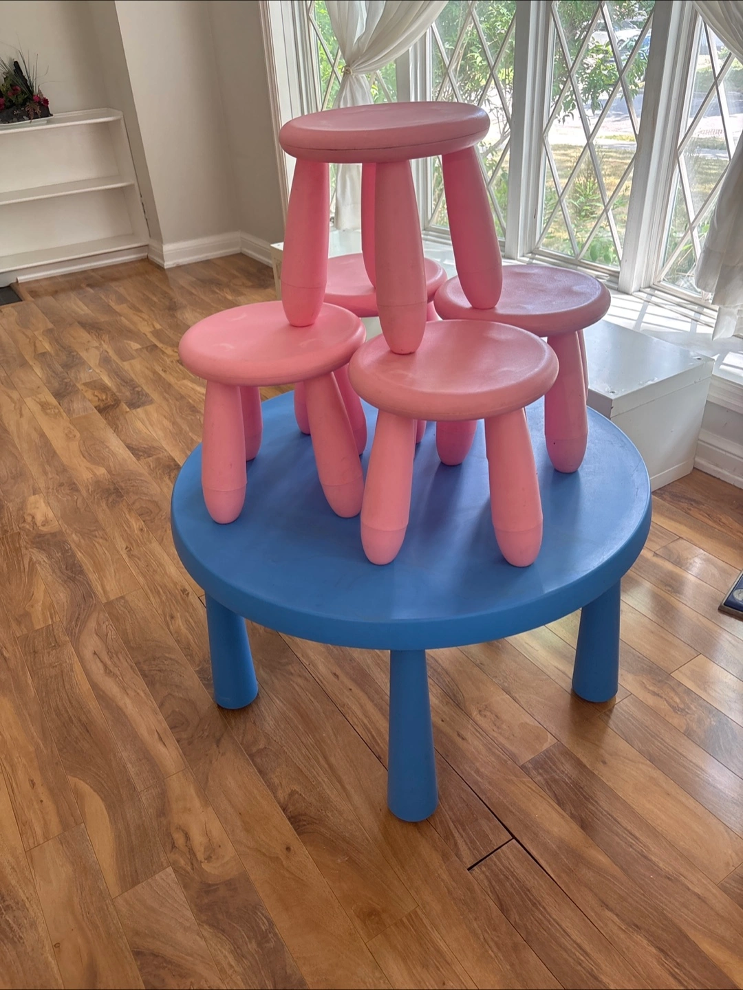 Selling a used IKEA Mammut table and four stools. Perfect for kids' activities and play! The table is blue, and the stools are pink. They're in good condition and ready for a new home