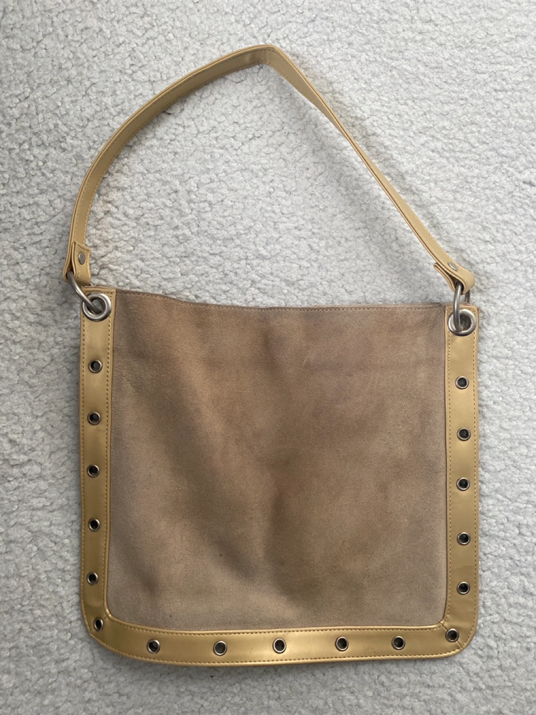This is a stylish beige suede shoulder bag in great condition! It has a magnetic clasp at the top to keep it closed. It's perfect for everyday use and adds a touch of elegance to any outfit
