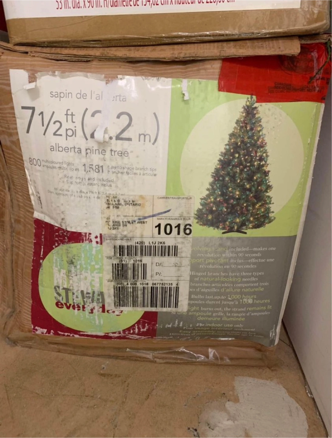 47Selling a 7 1/2 ft Alberta Pine Tree that comes with multicoloured lights! It also has easy-to-shape branch tips. The hinged branches feature three types of natural-looking needles, and the bulbs last up to 1000 hours. Revolving stand included - makes one revolution within 90 seconds. The box is included