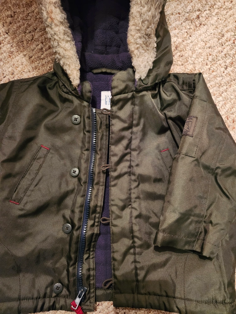 22Cozy baby Gap winter jacket in excellent condition! It's a size XL, which fits babies around 18-24 months. The jacket features a warm, faux-fur trimmed hood and a full zip closure.. Perfect for keeping your baby warm and stylish! Located north , can meet /deliver Londonderry, Northgate Skyview area