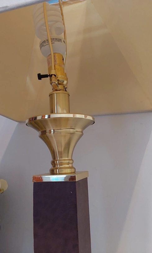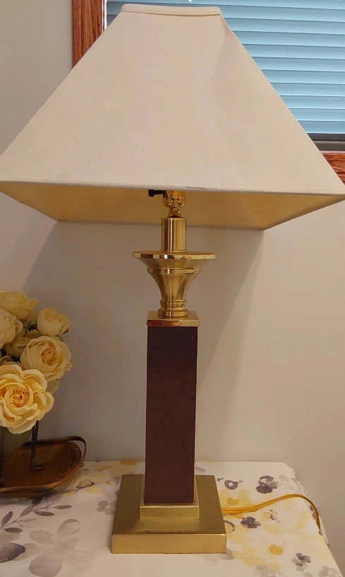 Selling a lovely vintage-style table lamp! It has a square lampshade and a unique brown and gold design. It would be a great addition to any room! purchased at LAZYBOY