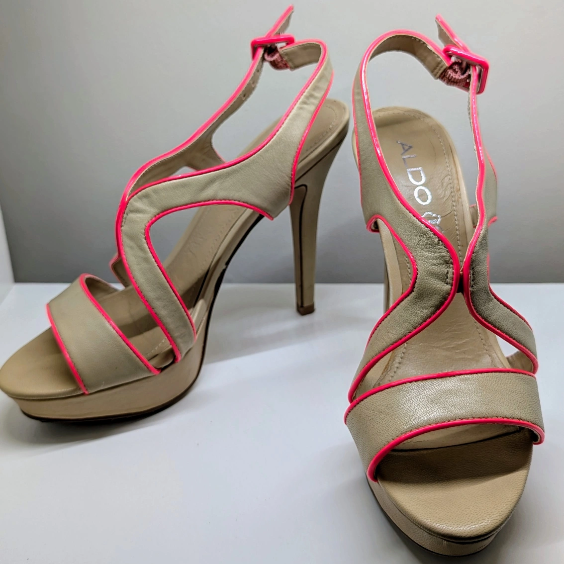 These Aldo heels are super cute! They're a beige colour with a vibrant pink trim that really makes them pop. They're a size 6 and would be perfect for a night out or a special occasion. The heel height is just over 4 inches.