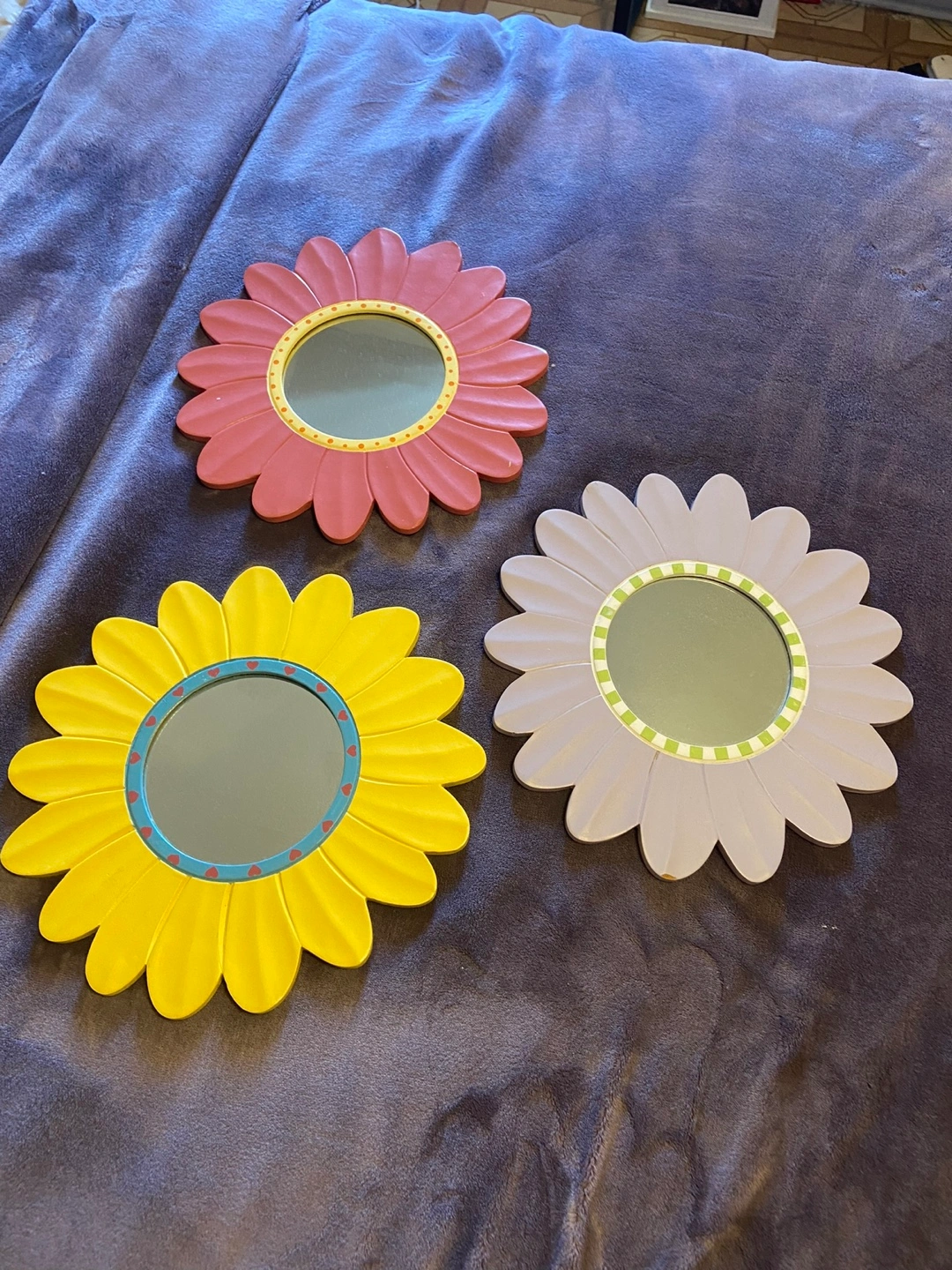 Selling a set of 3 adorable sunflower mirrors $3 for all) perfect for a kid's room, any hallways, or the bathroom. They are from Bombay Kids. One is yellow, one is pink, and the other is grey. There are some minor signs of wear, as shown in the pictures