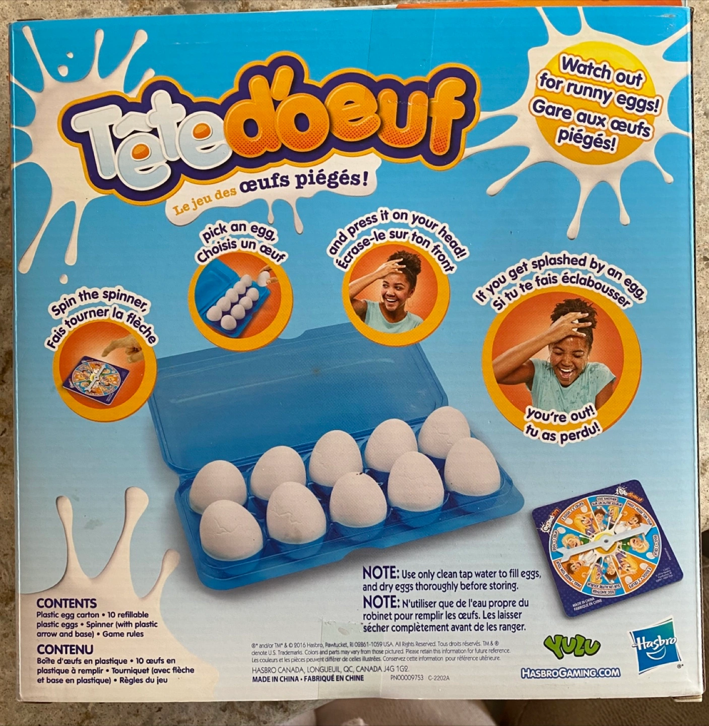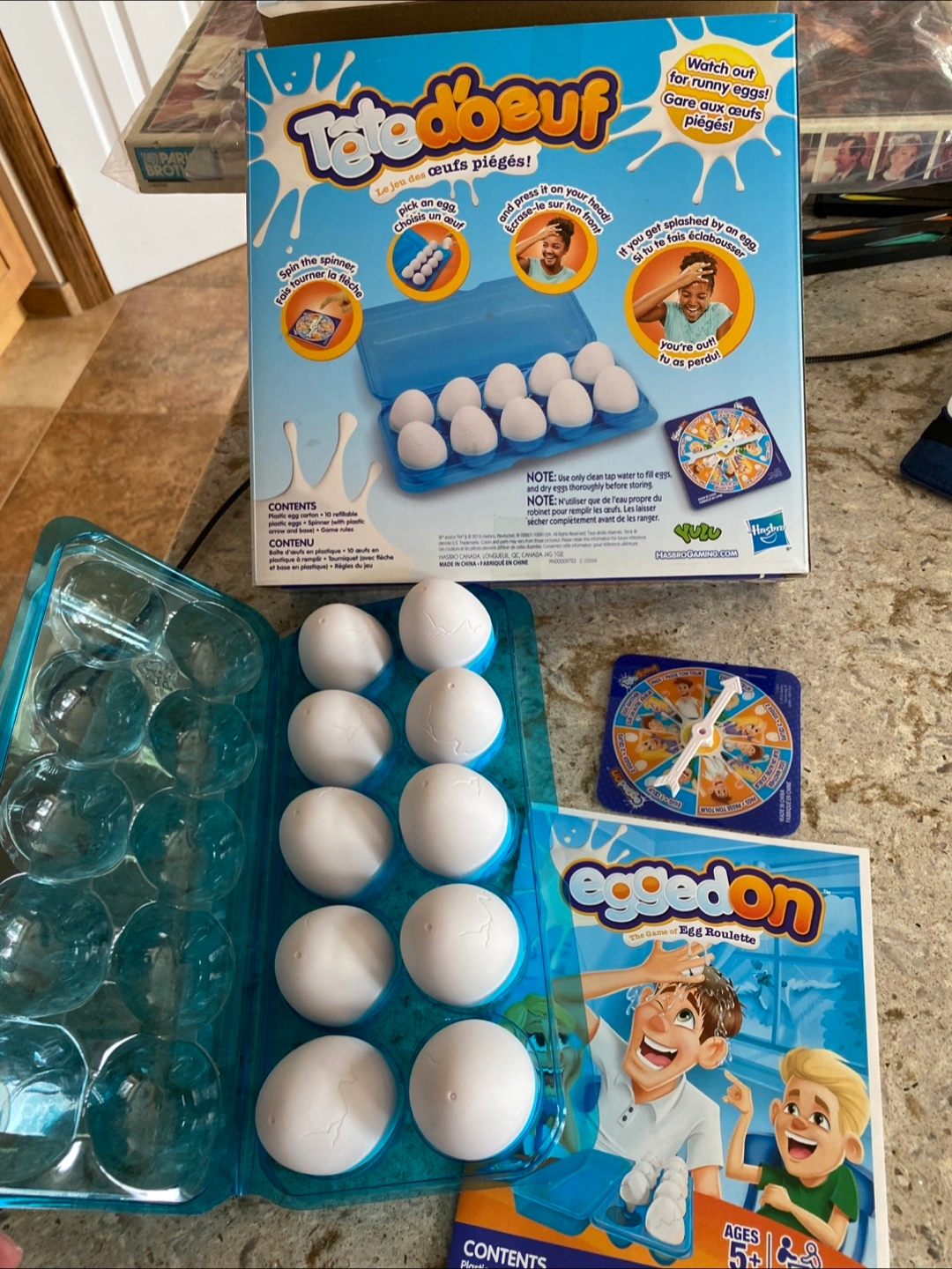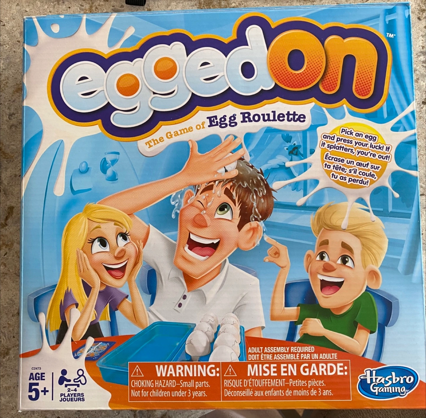 Get ready for some egg roulette fun with this Egged On game! It includes a plastic egg carton with 10 refillable plastic eggs, a spinner, and game rules. Suitable for ages 5 and up and for 2-4 players. Watch out for runny eggs!