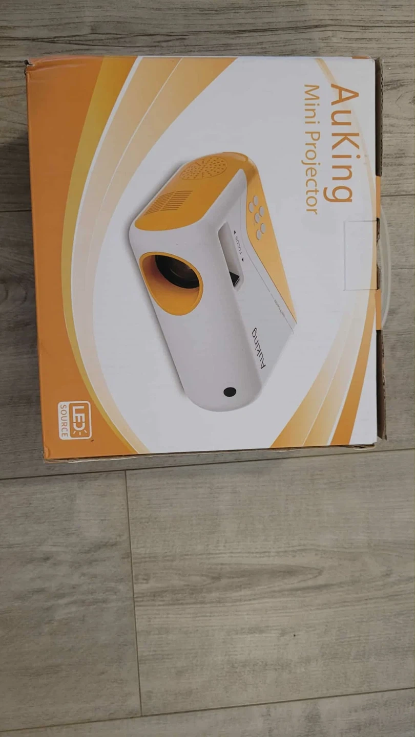 This is an AuKing mini projector. It boasts a lamp life of 50,000 hours. The projector is compatible with multiple devices like smartphones, laptops, and PS4. Its compact size makes it easy to carry around. It projects a screen size up to 170 inches.