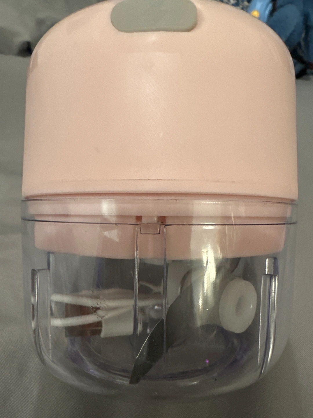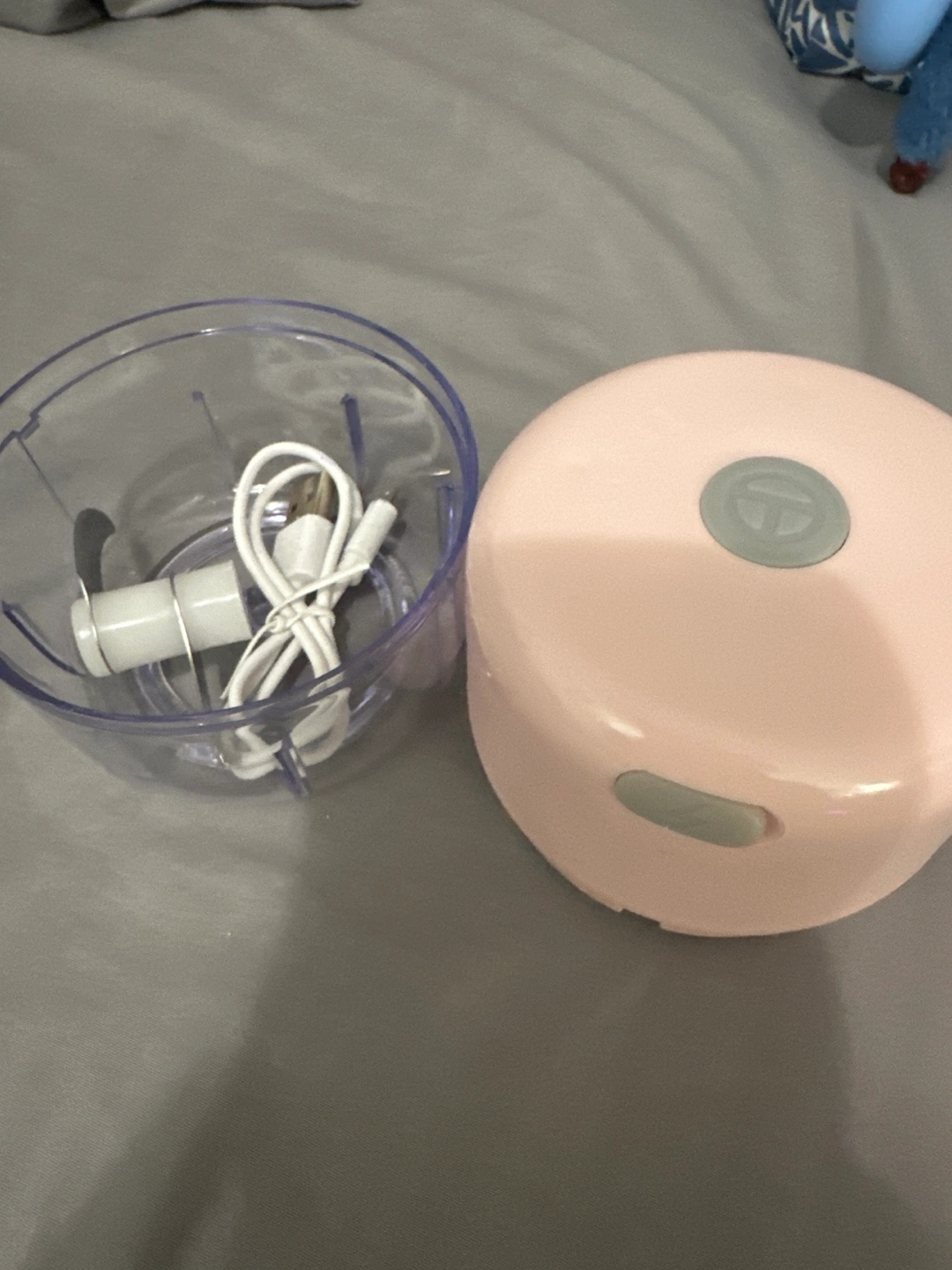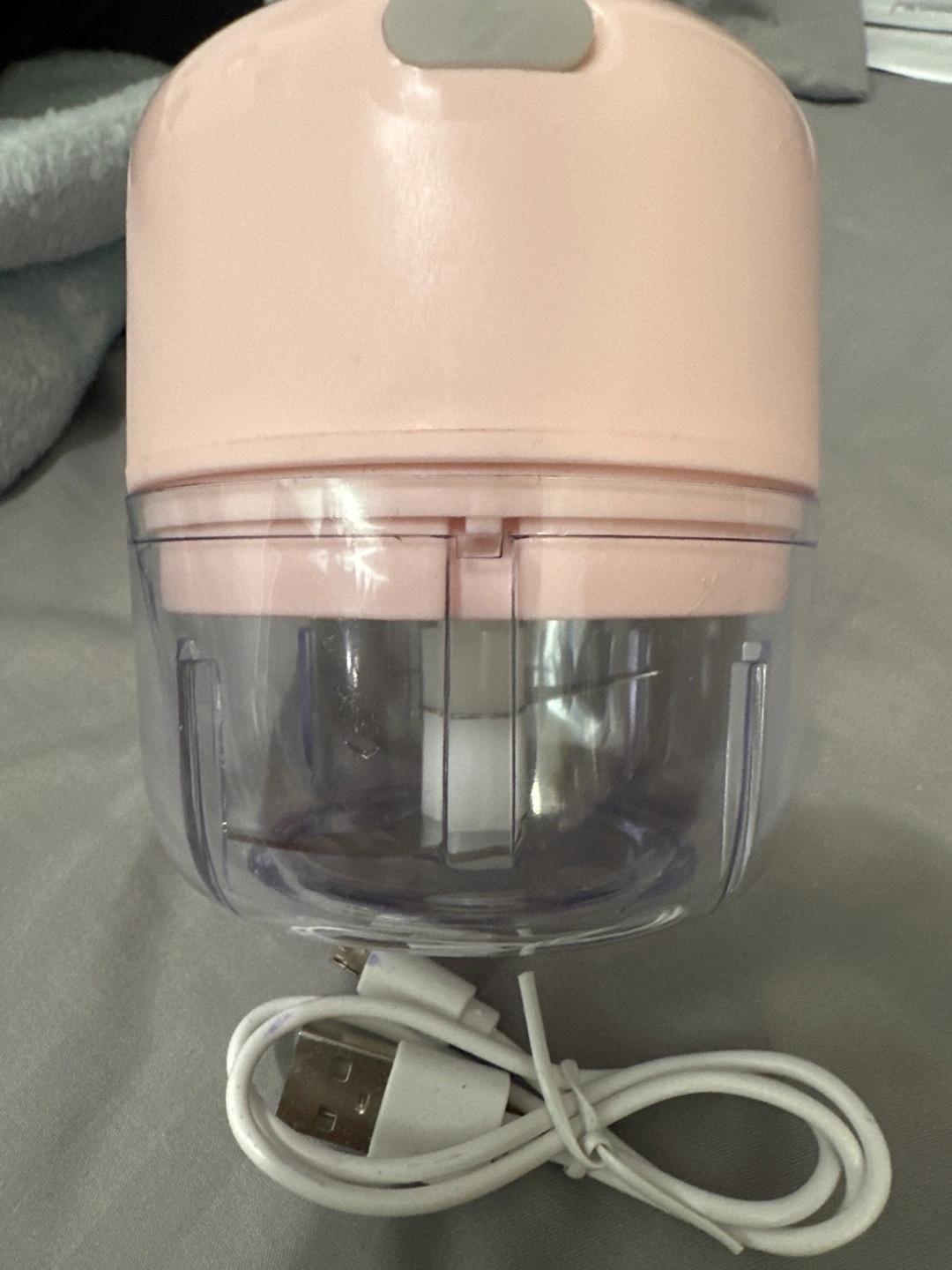 I'm selling a pink mini electric food chopper. It comes with a USB charging cable. It's in great condition and ready for a new home!