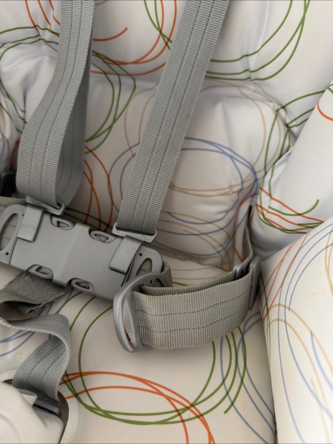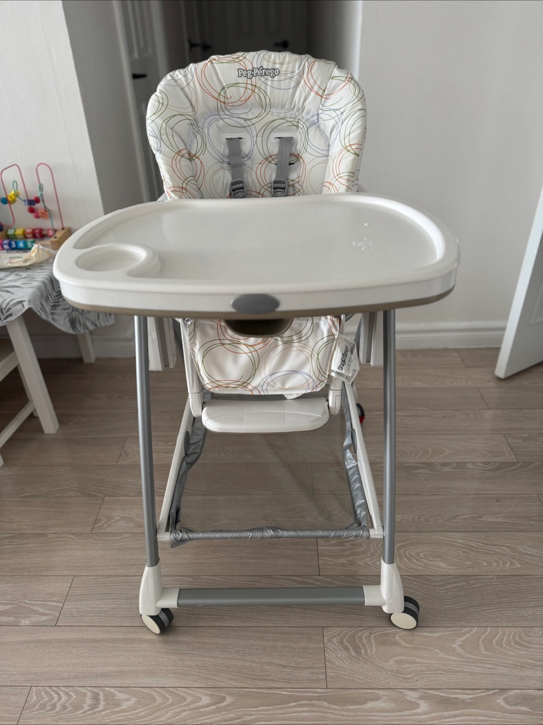 Notes: Little slit on the high chair cushion. Pasta sauce stains on seat cushion (you can buy a new cover on Amazon). Removable table has peeling plastic on it.