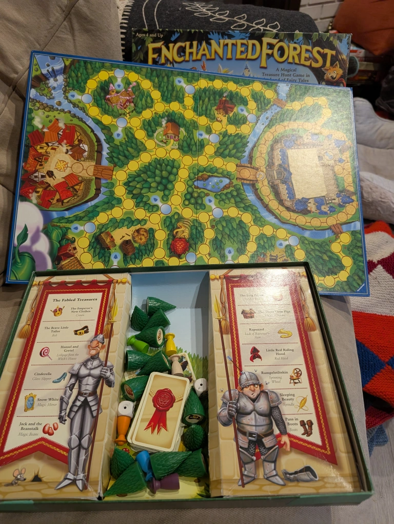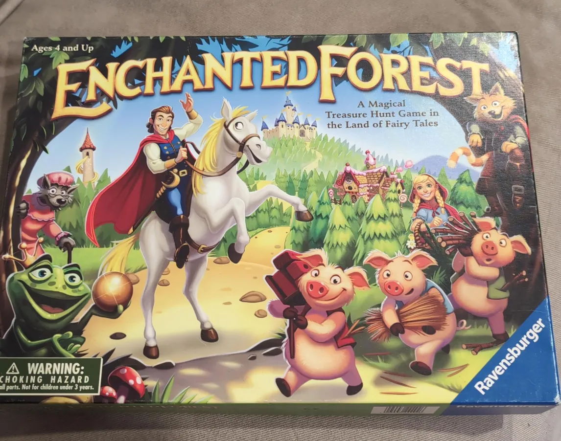 Selling a gently used Enchanted Forest board game! It's a magical treasure hunt game set in the Land of Fairy Tales, perfect for ages 4 and up. Includes all the pieces and the original box. Hours of fun for the whole family!