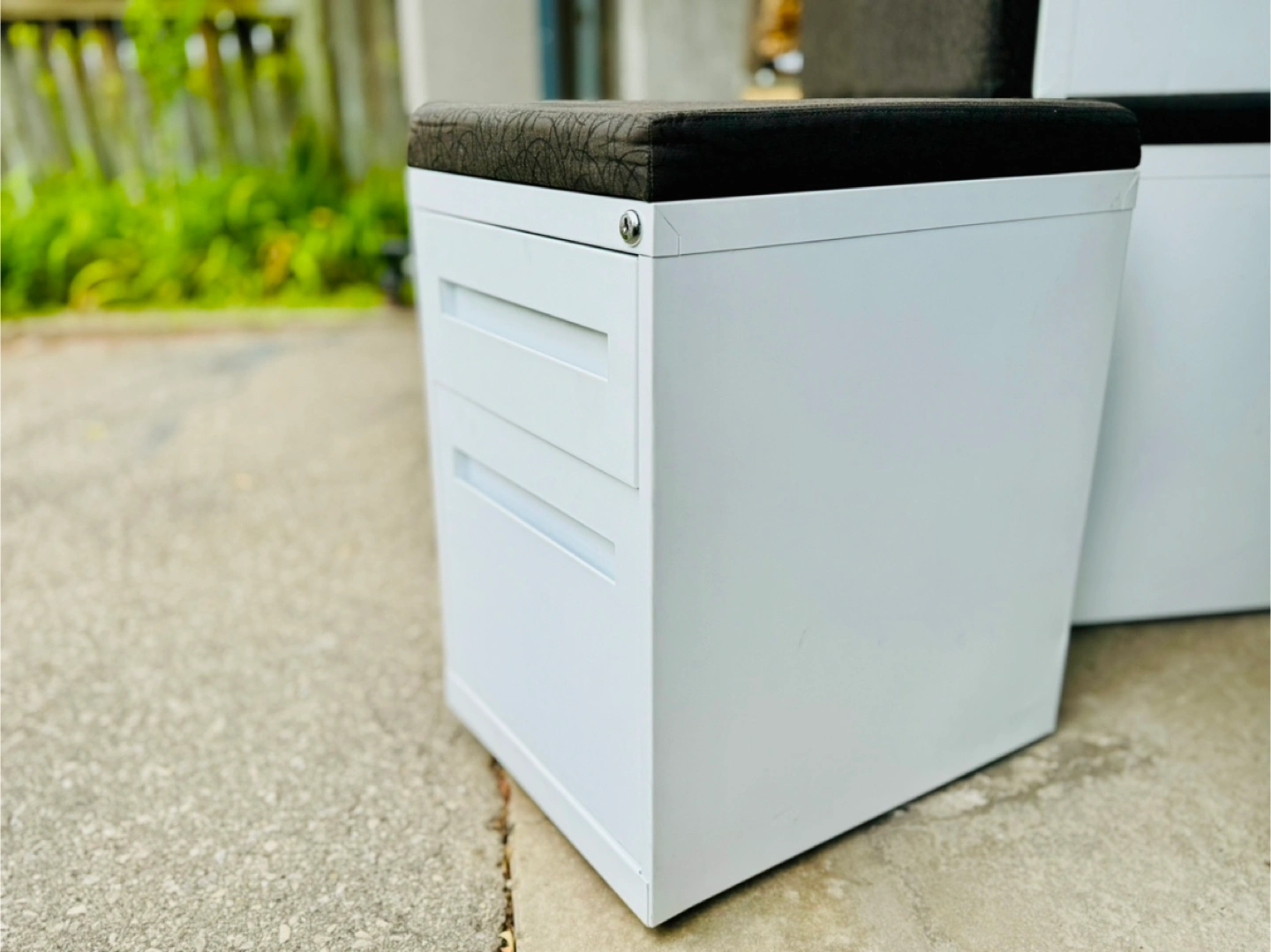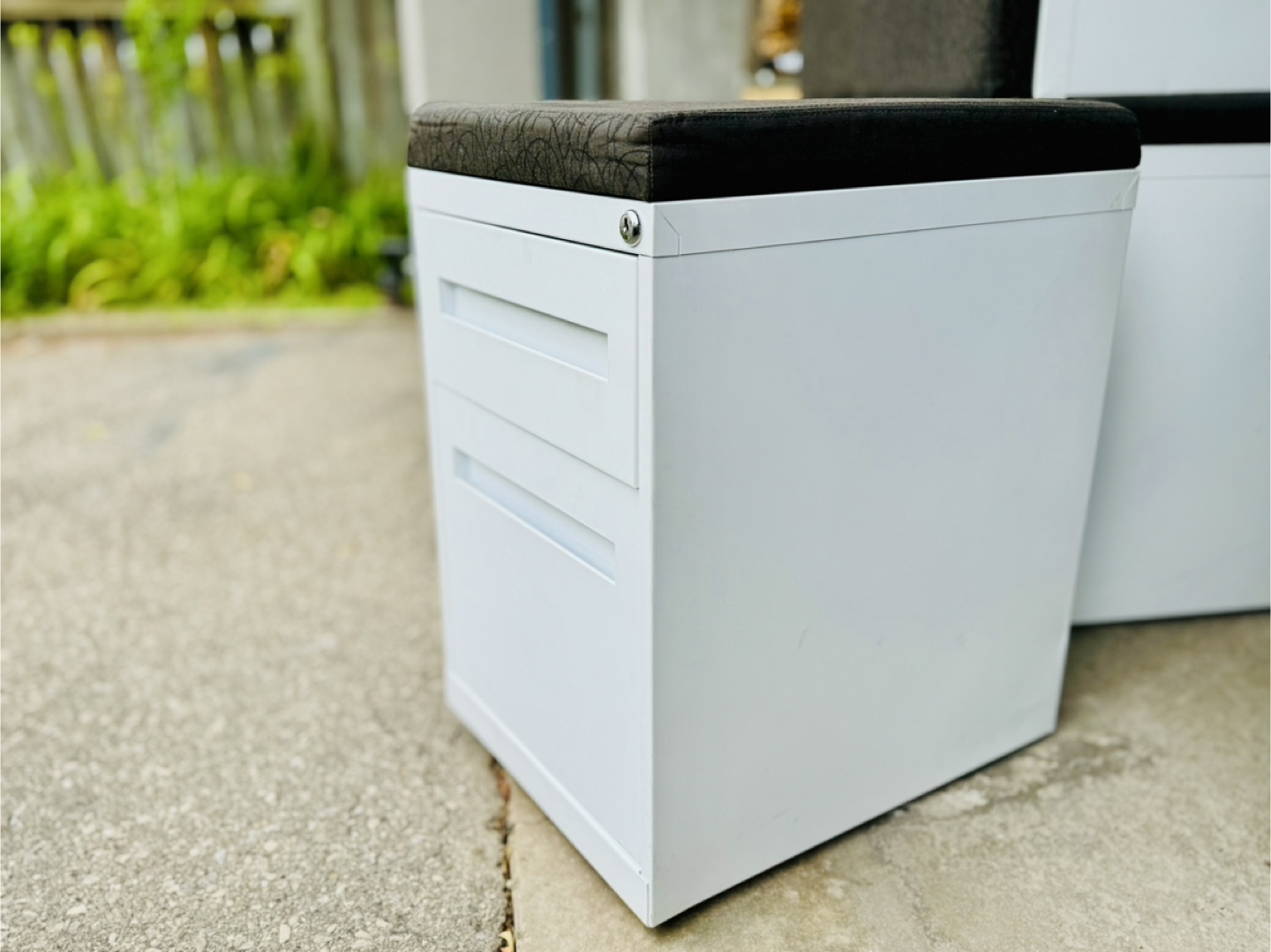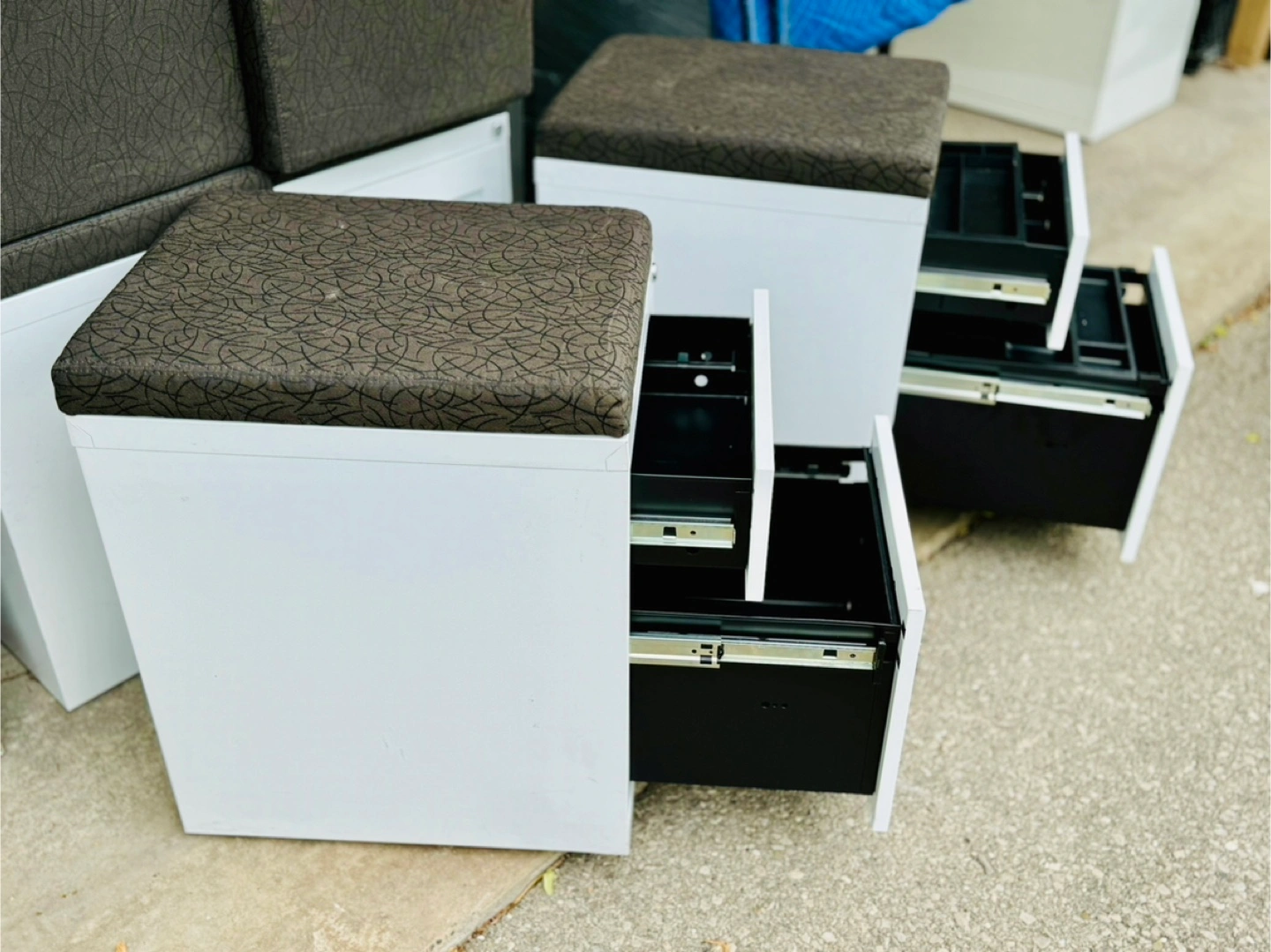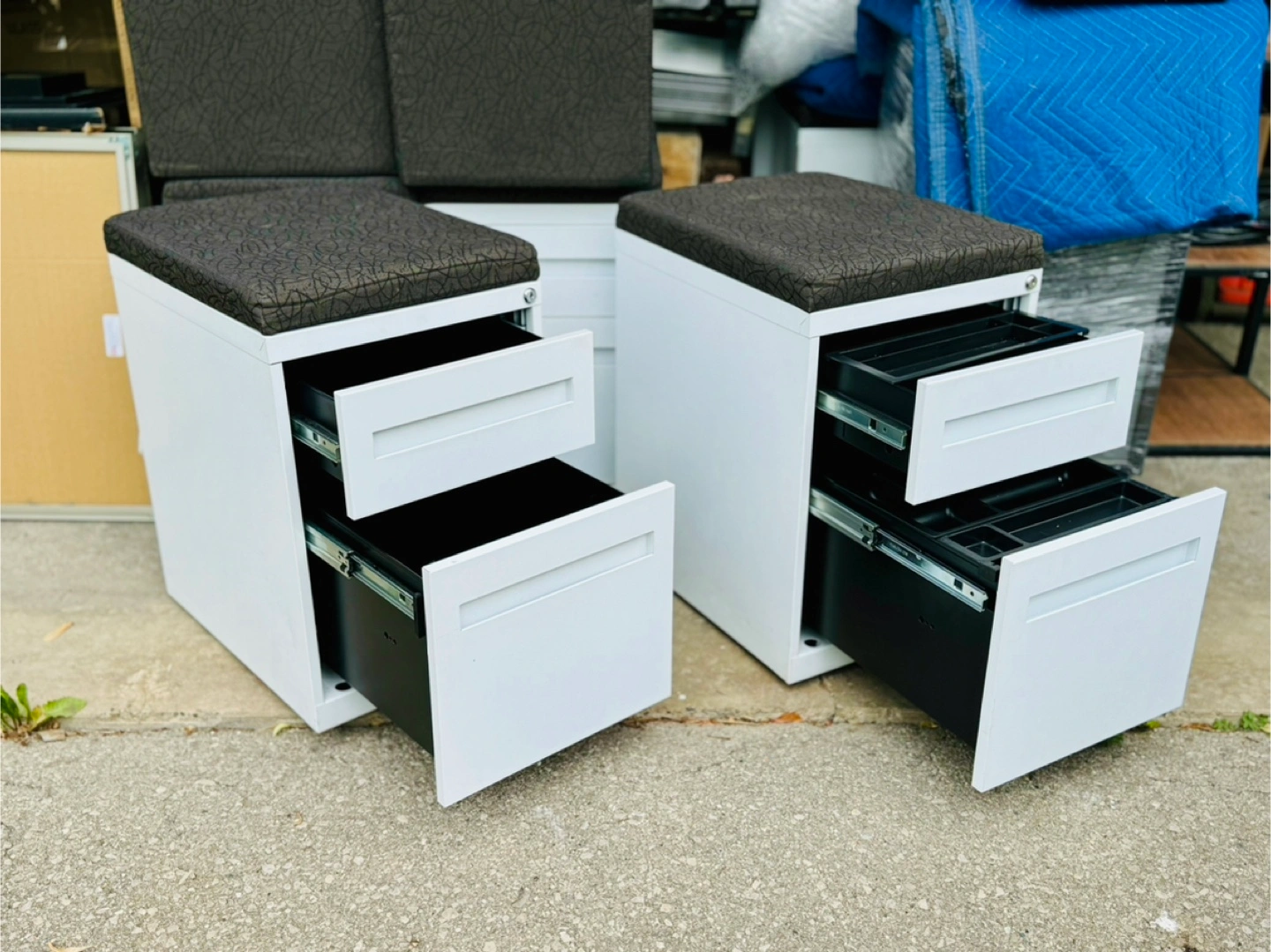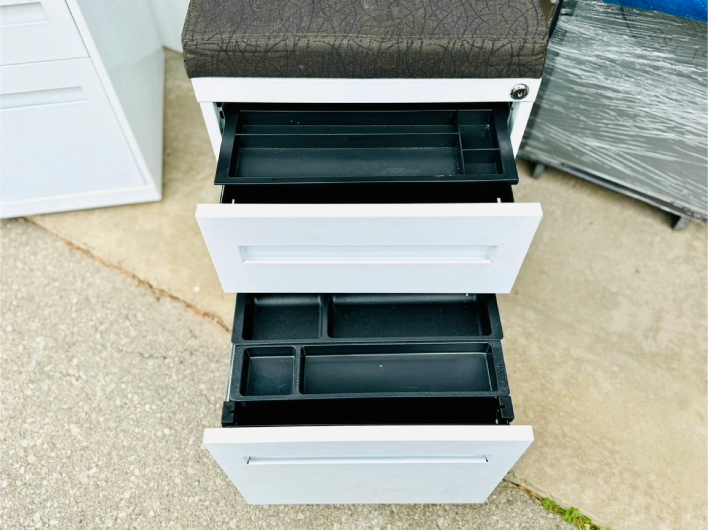 Looking to sell these handy file cabinets! I'm selling 6 white filing cabinets with a working lock and key, perfect for adding secure storage to your office or home! This compact cabinet features a comfortable cushioned top for sitting, making it a versatile piece of furniture. It is in gently used condition. Selling due to office remodeling. High gauge steel. Made in Canada.