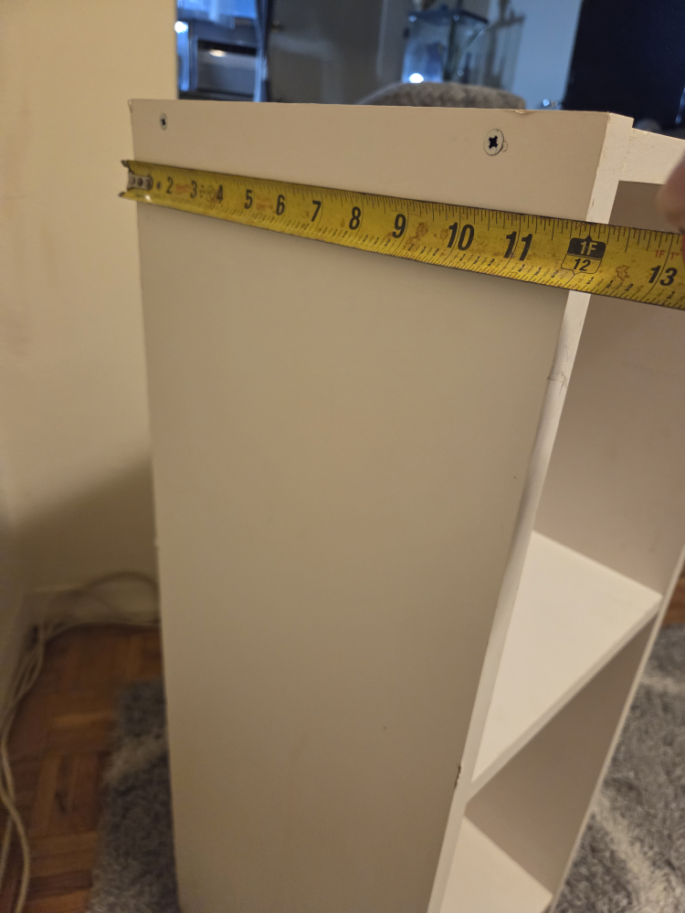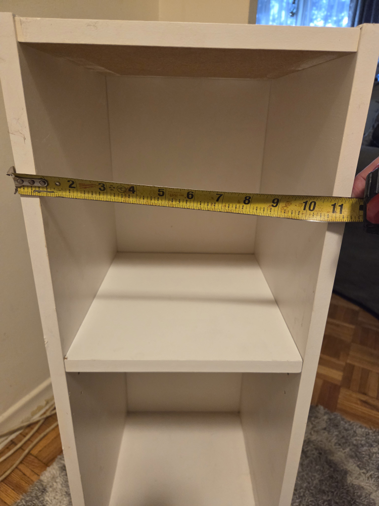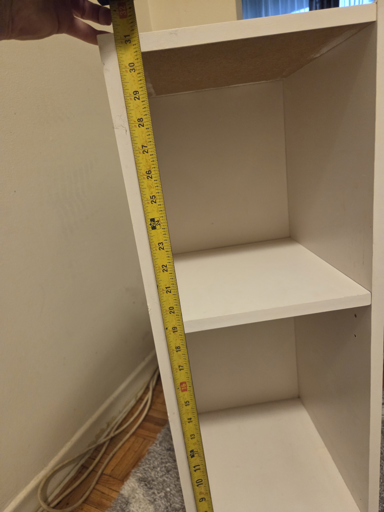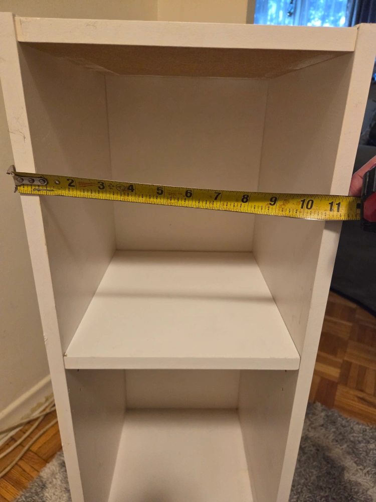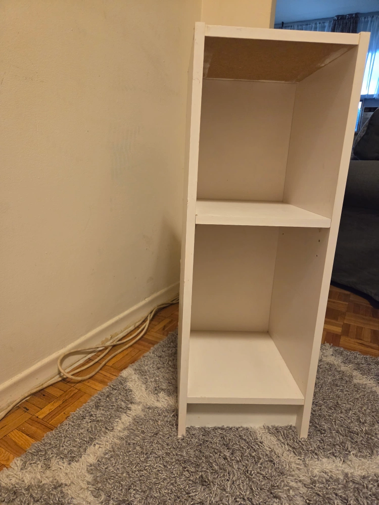 Selling a simple white bookcase with two shelves! It's about 31 inches tall and 11 inches wide. Perfect for small spaces or organizing your books and trinkets