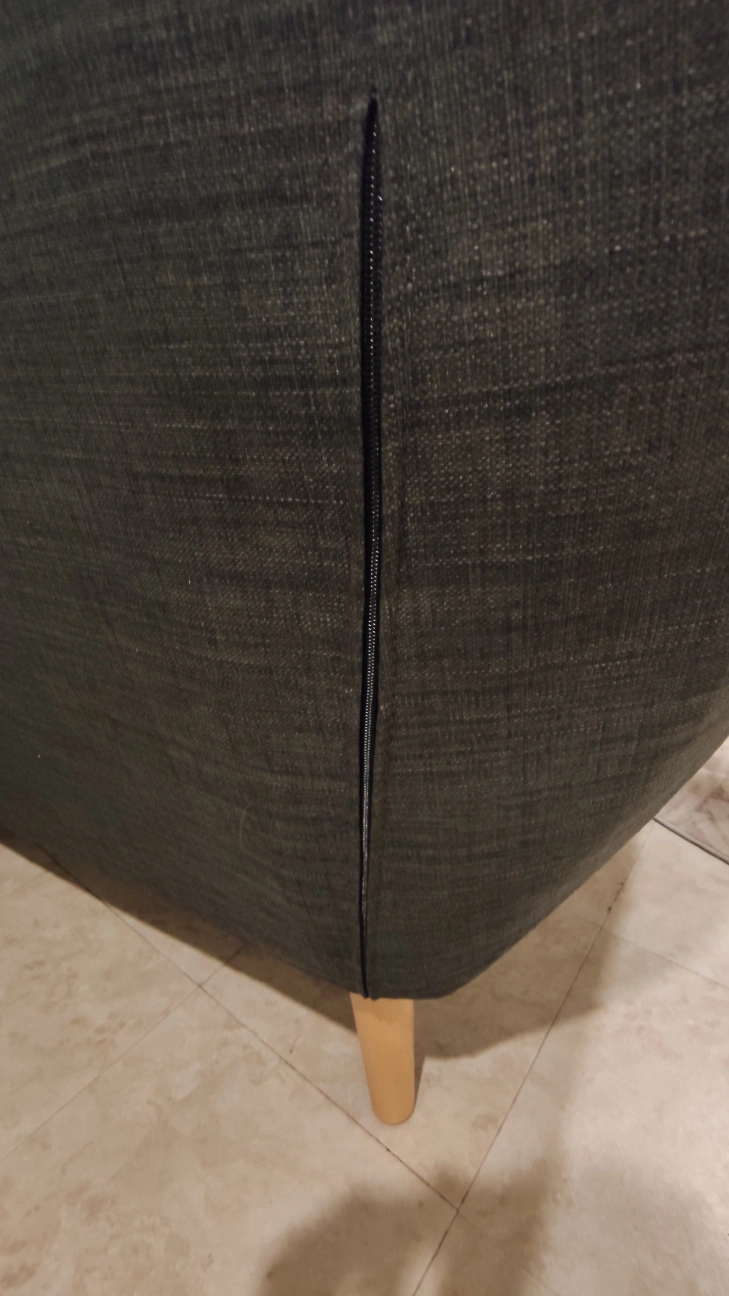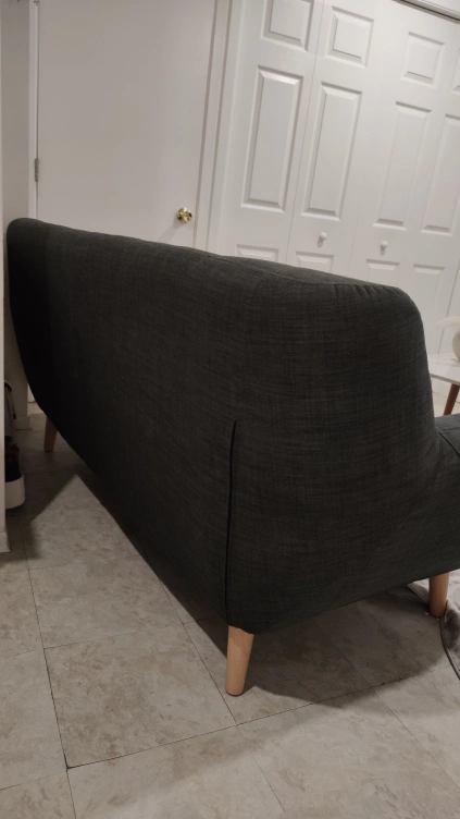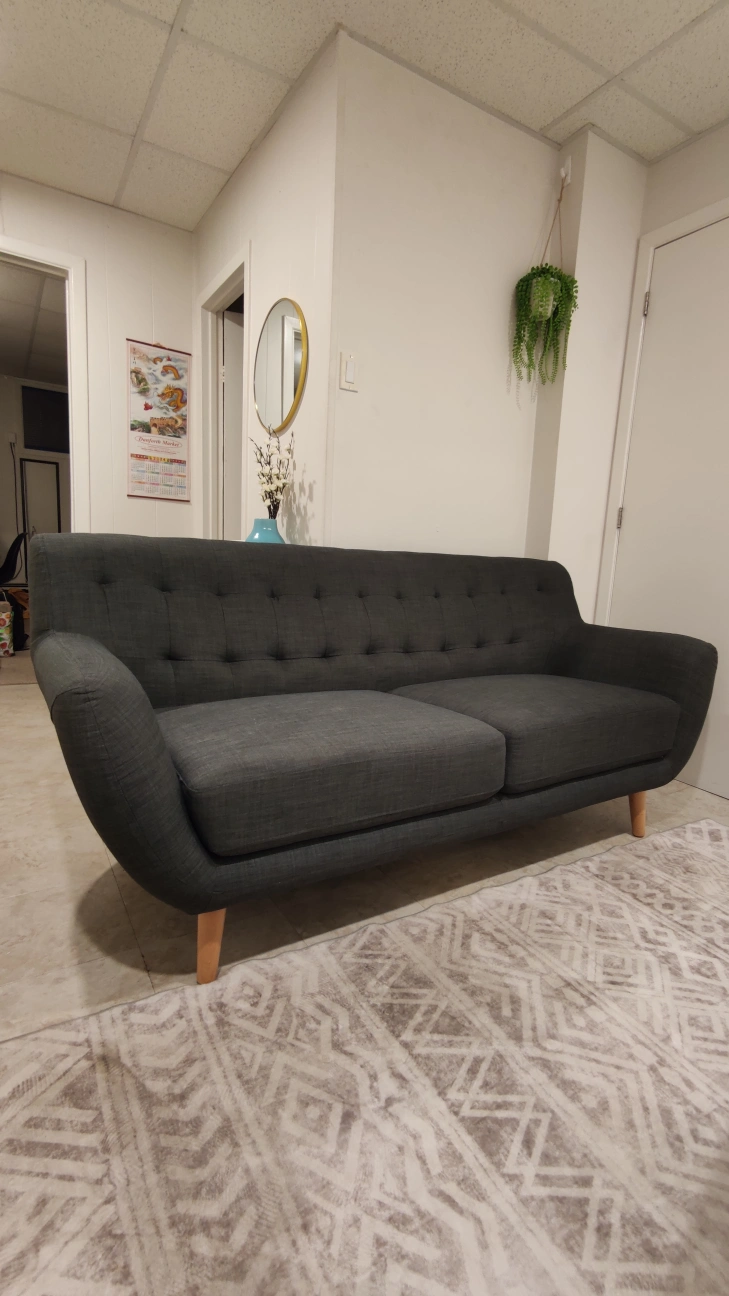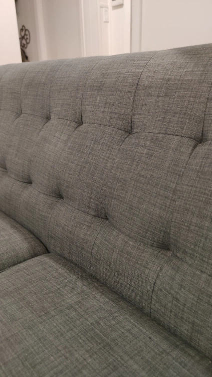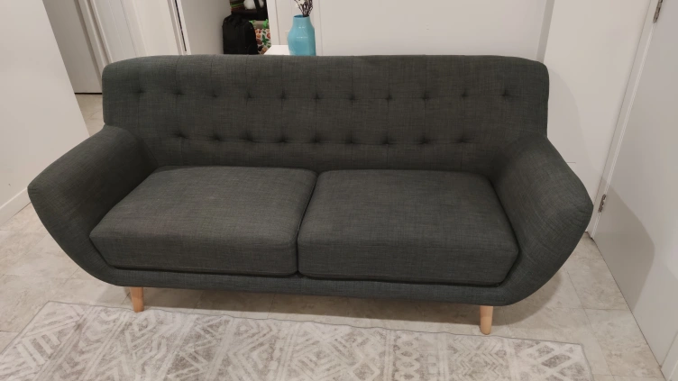 Comfy grey mid century modern sofa with a tufted back. The legs screw off and there's a zip at the back of either side to store the legs.