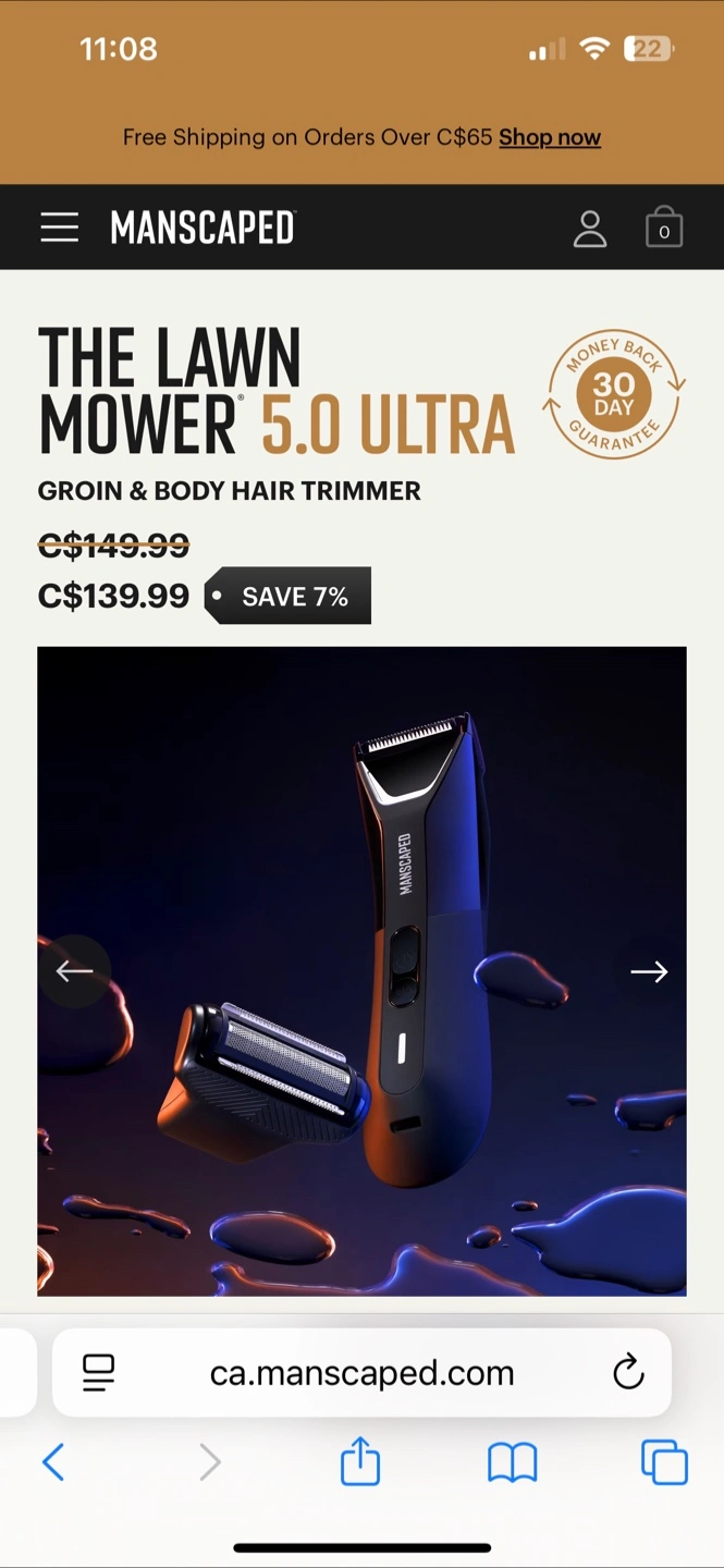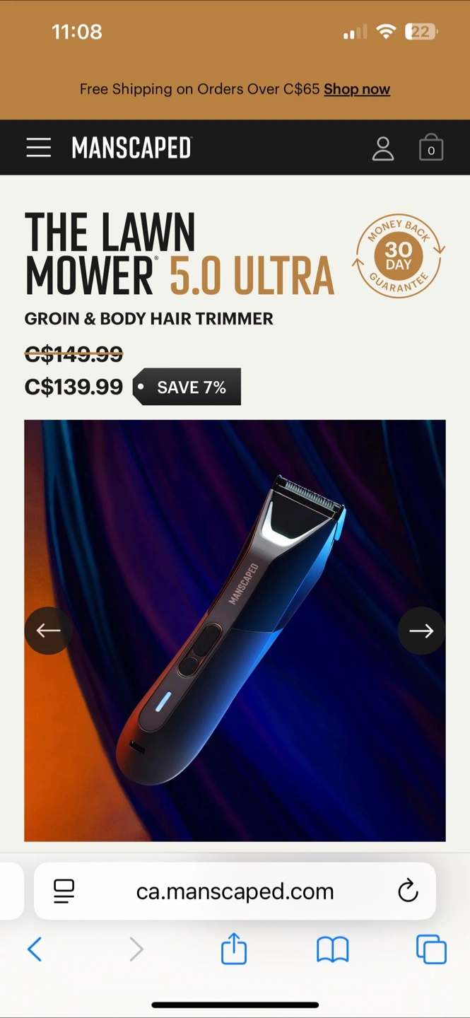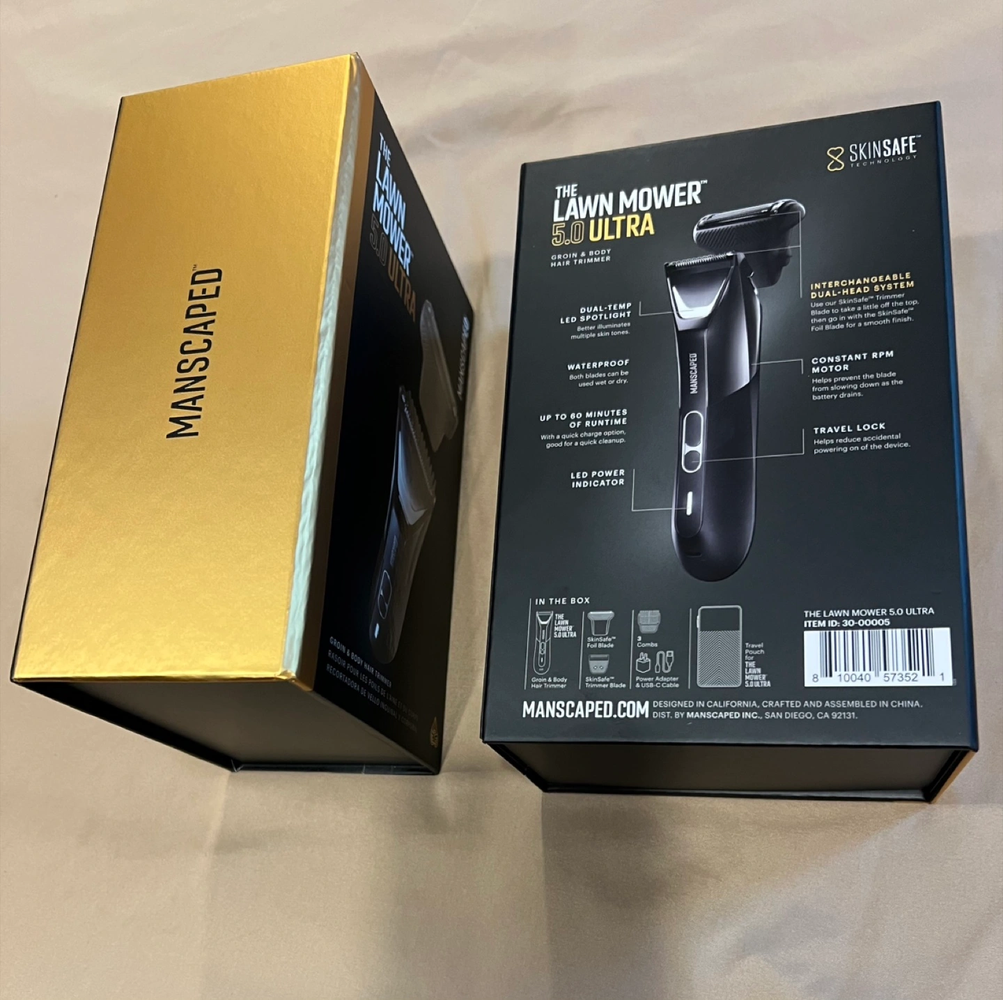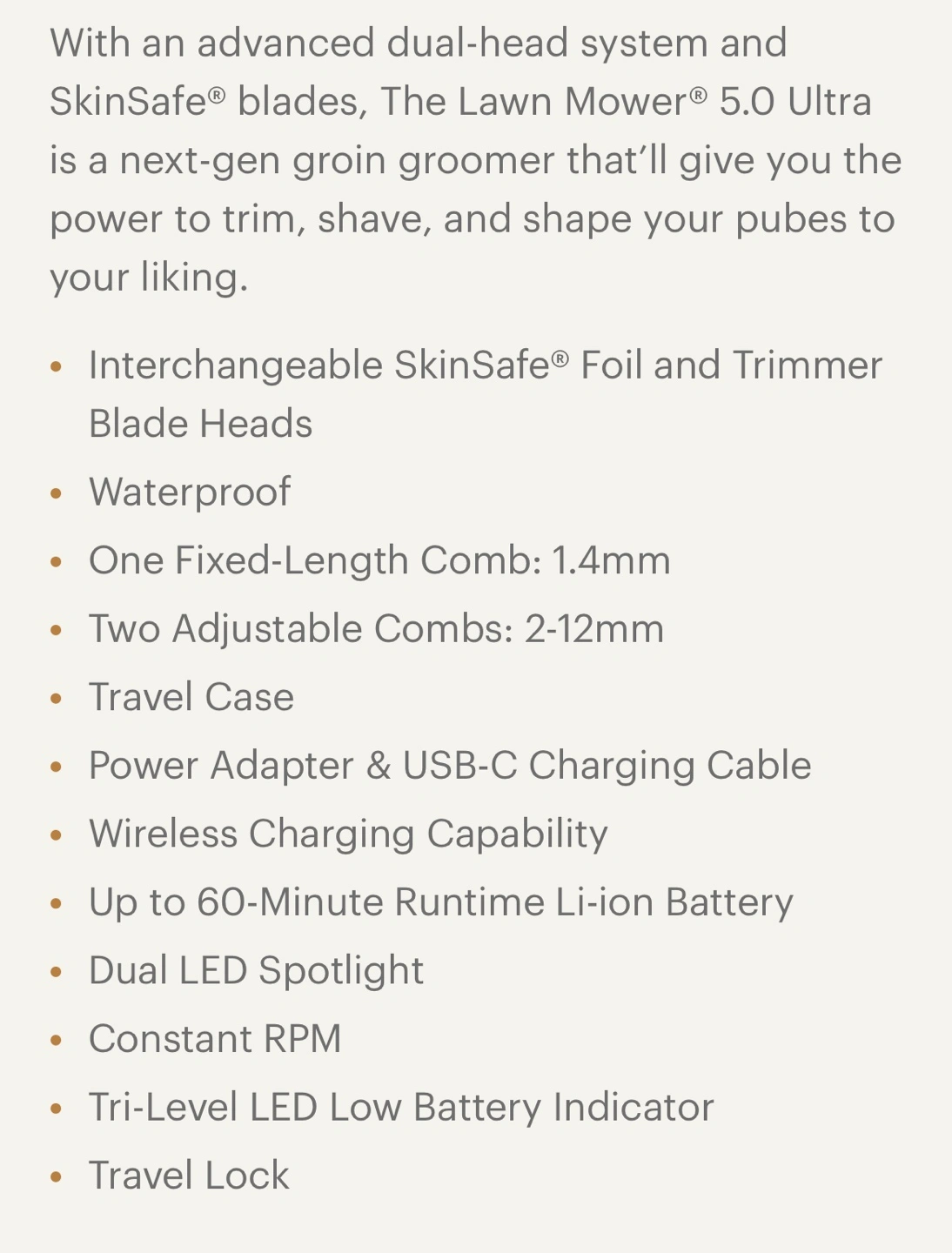 Manscaped The Lawn Mower 5.0 Ultra groin and body hair trimmer, featuring SkinSafe technology, a dual-head system, and waterproof design. It also boasts USB-C and Qi compatibility, a quick charge option, and a dual-temp LED spotlight. Plus, it comes with a travel lock, making it perfect for on-the-go grooming.