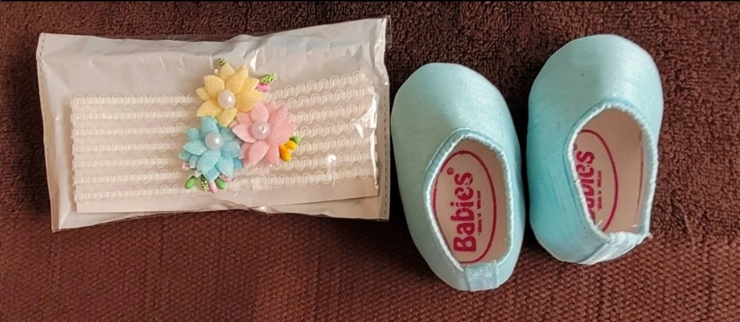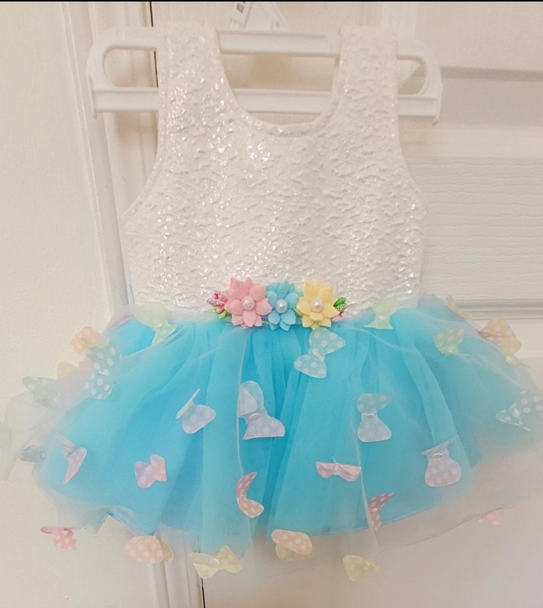 A beautiful 3 months baby girl dress with a sequined top and a blue tulle skirt adorned with butterflies. It also comes with matching shoes and a headband with floral accents. Perfect for a special occasion or just to dress up your little one!