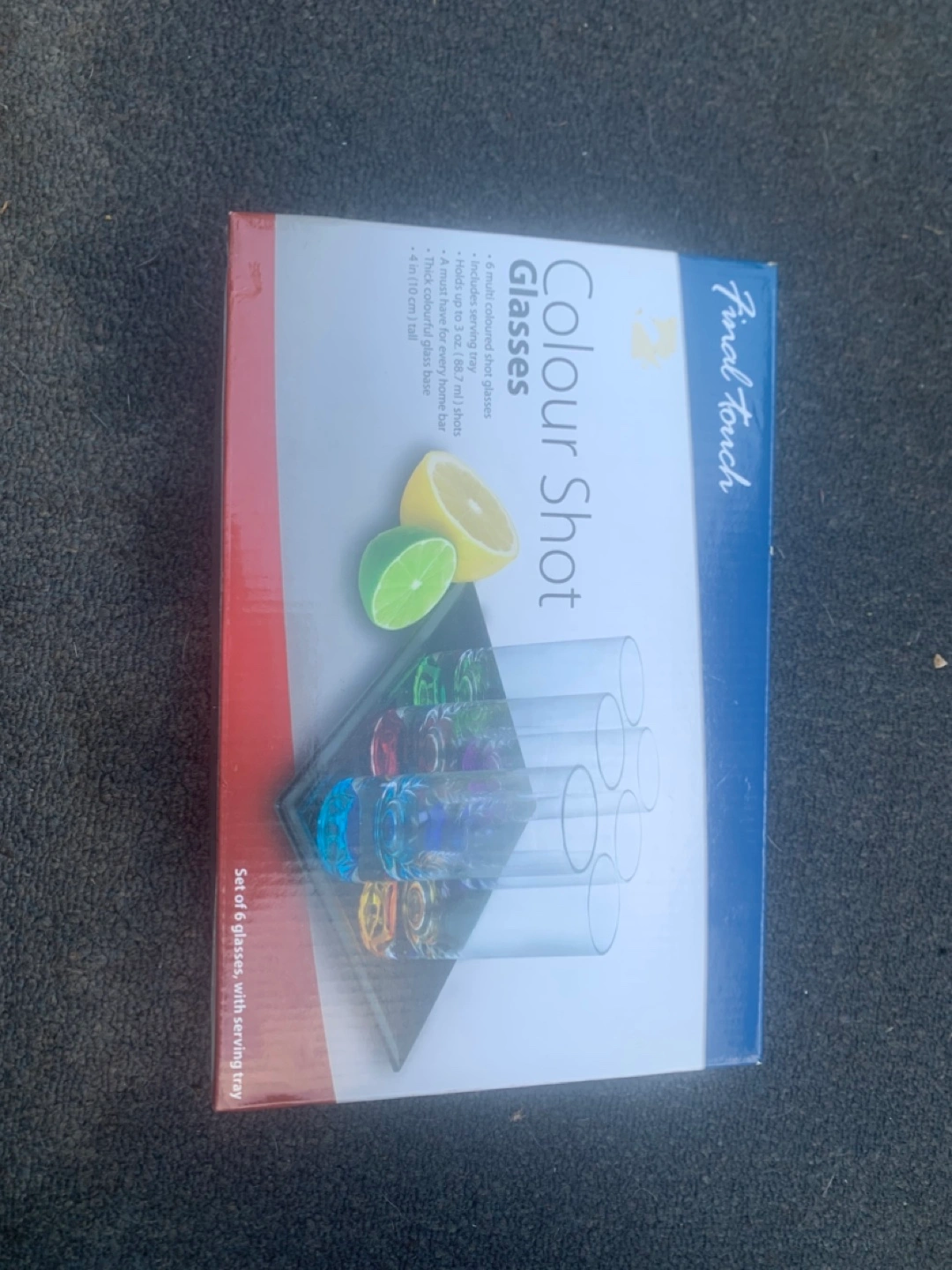 Selling a set of Final Touch Colour Shot Glasses! This set includes 6 multi-coloured shot glasses, each with a thick, colourful glass base. It also includes a serving tray. Each glass holds up to 3 oz (88.7 ml). They're 4 inches (10 cm) tall and a must-have for any home bar!