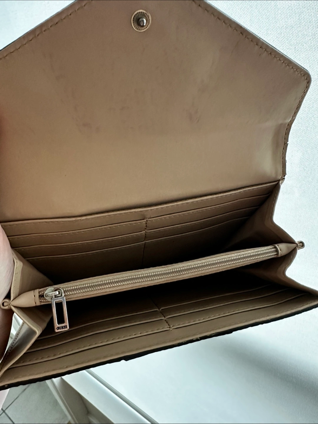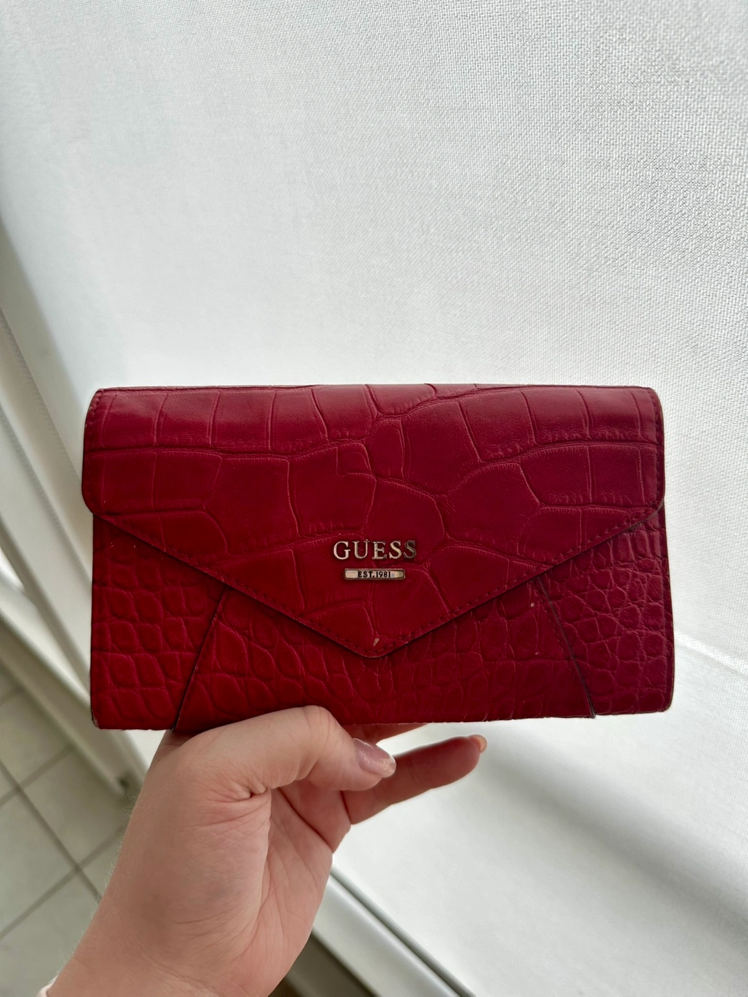 Red Guess wallet in fantastic condition. Lots of card slots, an internal zipper for coins, and slots for notes. In great condition.