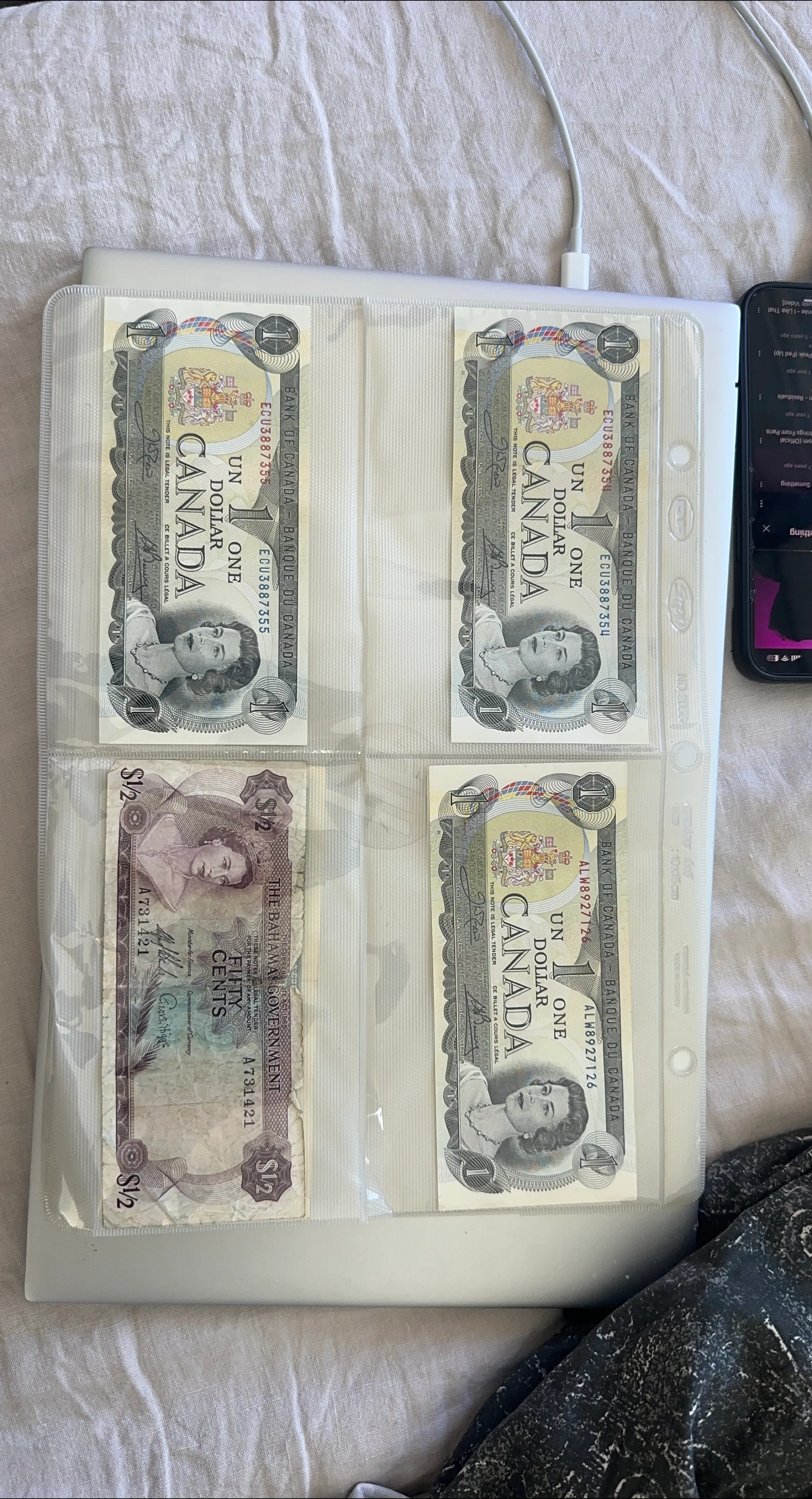 I'm selling a collection of Canadian one-dollar banknotes and a Bahamas fifty-cents banknote. These are unique pieces of currency, perfect for collectors or anyone interested in historical banknotes. Feel free to message me with any questions!