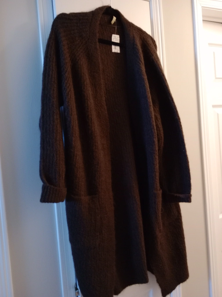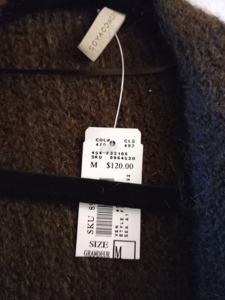 This is a stylish and cozy Soya Concept brown, long cardigan in a size medium, perfect for adding a layer of warmth and sophistication to any outfit, and it is in NEW condition.