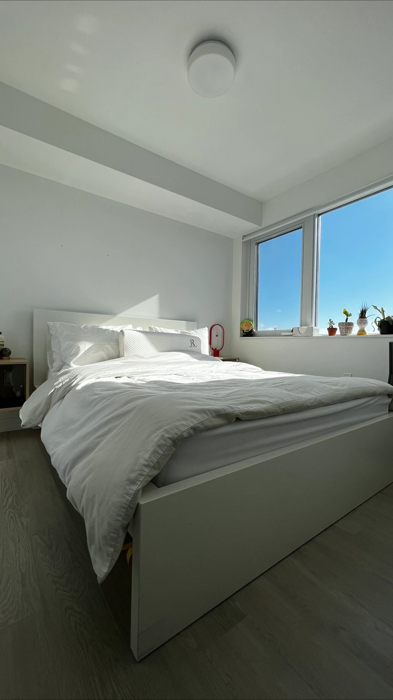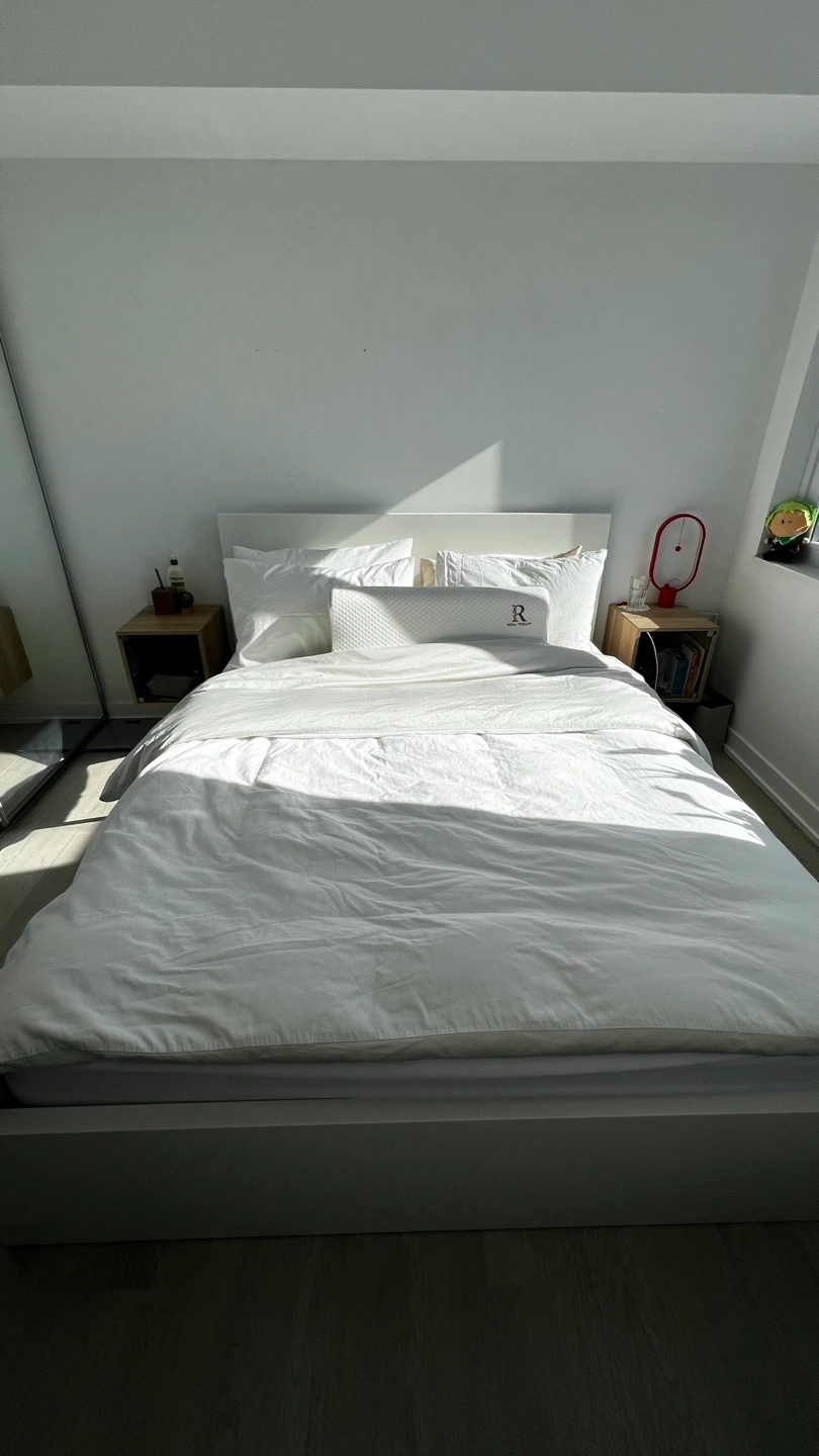 Selling a bed frame in great condition! It's a clean, white colour and would look great in any bedroom. All the pieces are included for easy assembly (includes Allen key, bed slats, and center support beam - usually sold separately).