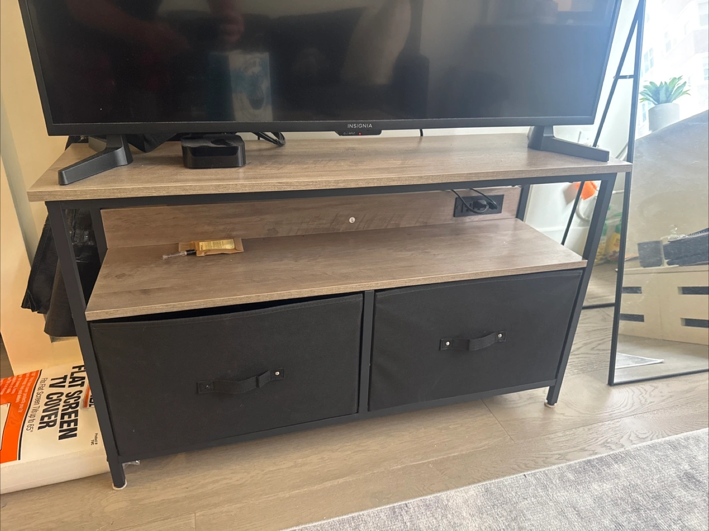 This is a TV stand with storage. It features a light wood-look top and a black metal frame. There are two storage drawers with fabric bins. It's in good condition and ready for a new home