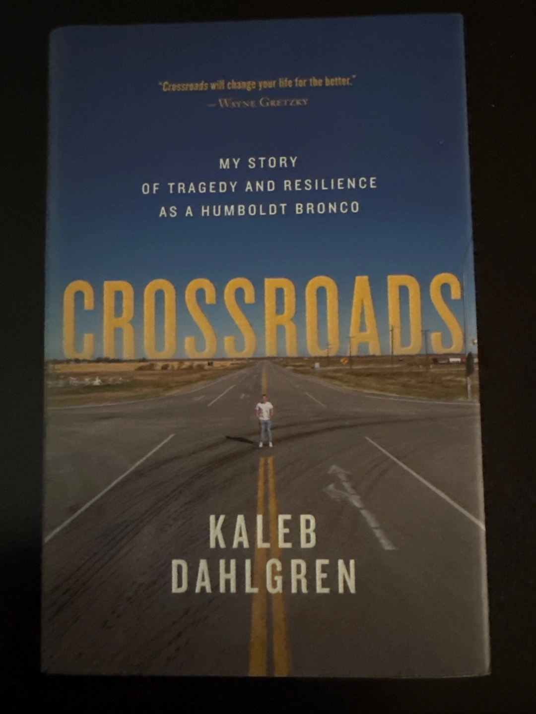 Selling the book Crossroads by Kaleb Dahlgren. It tells the story of tragedy and resilience as a Humboldt Bronco. A quote on the cover says, "Crossroads will change your life for the better" - Wayne Gretzky