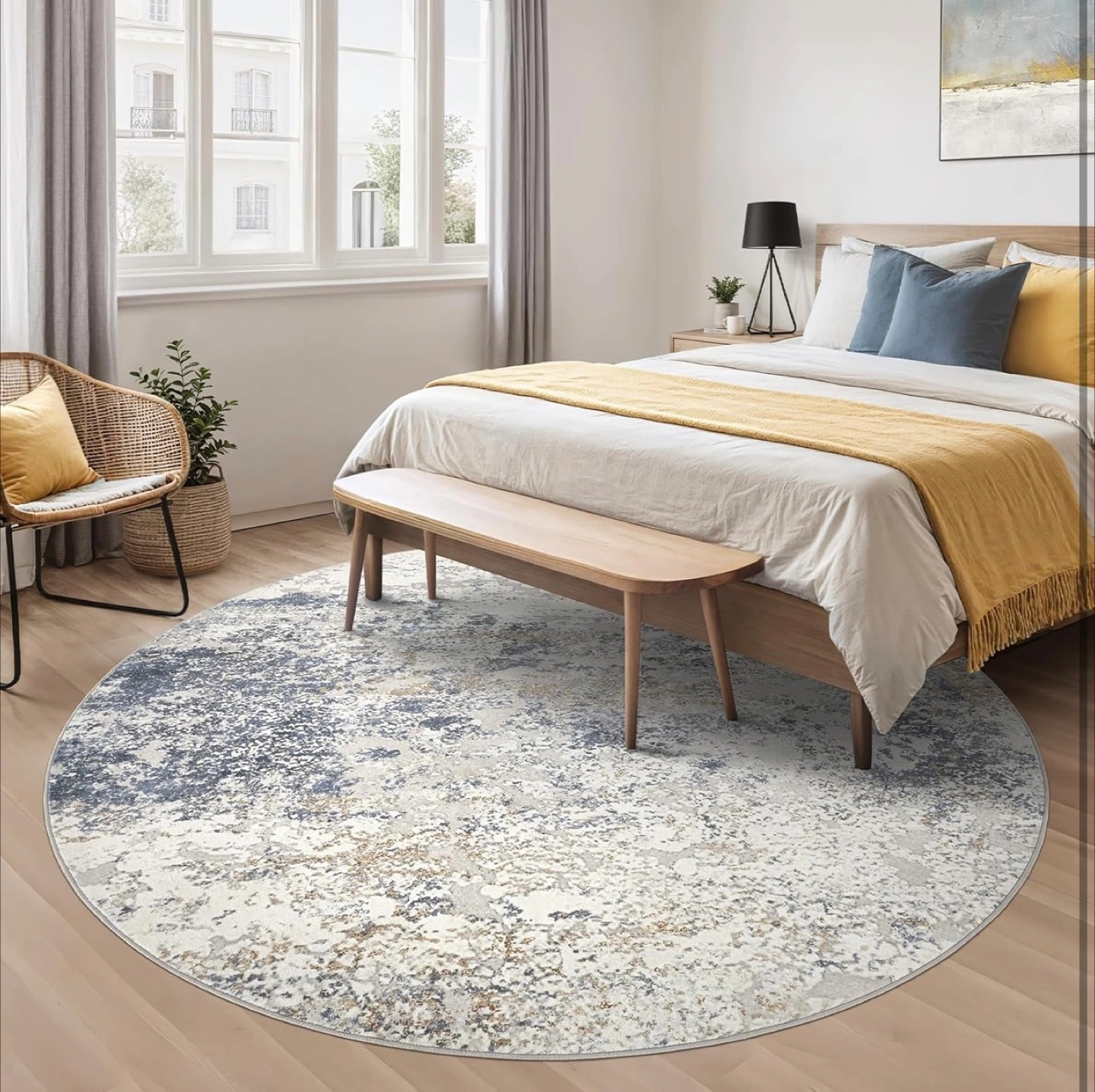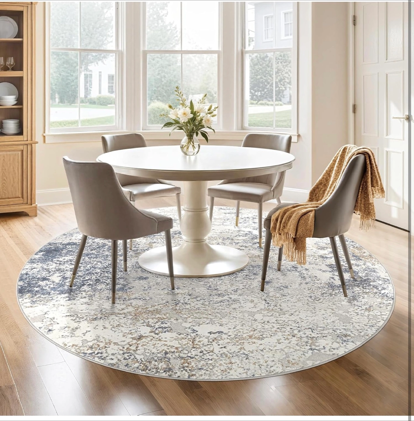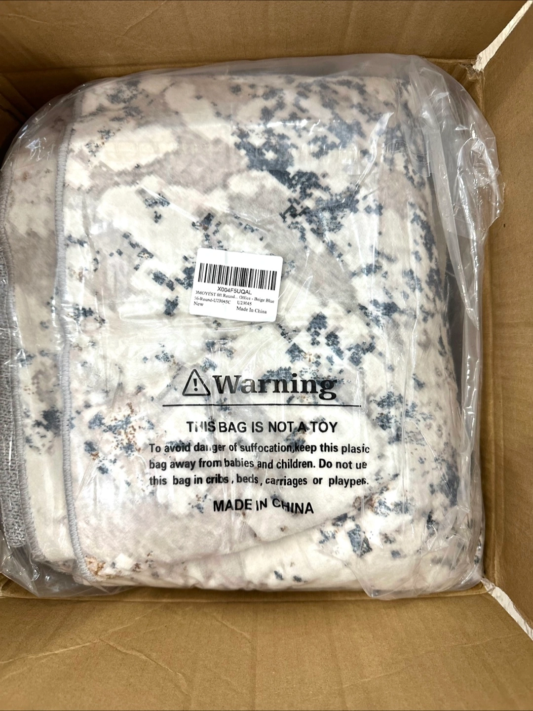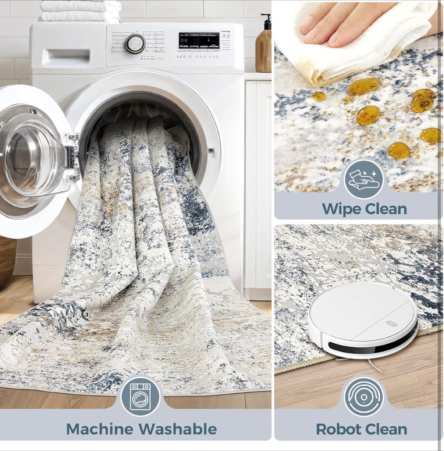 This round rug features an abstract design in beige and blue tones. It's machine washable and can be easily cleaned with a robot vacuum or by wiping. Comes in its original packaging!