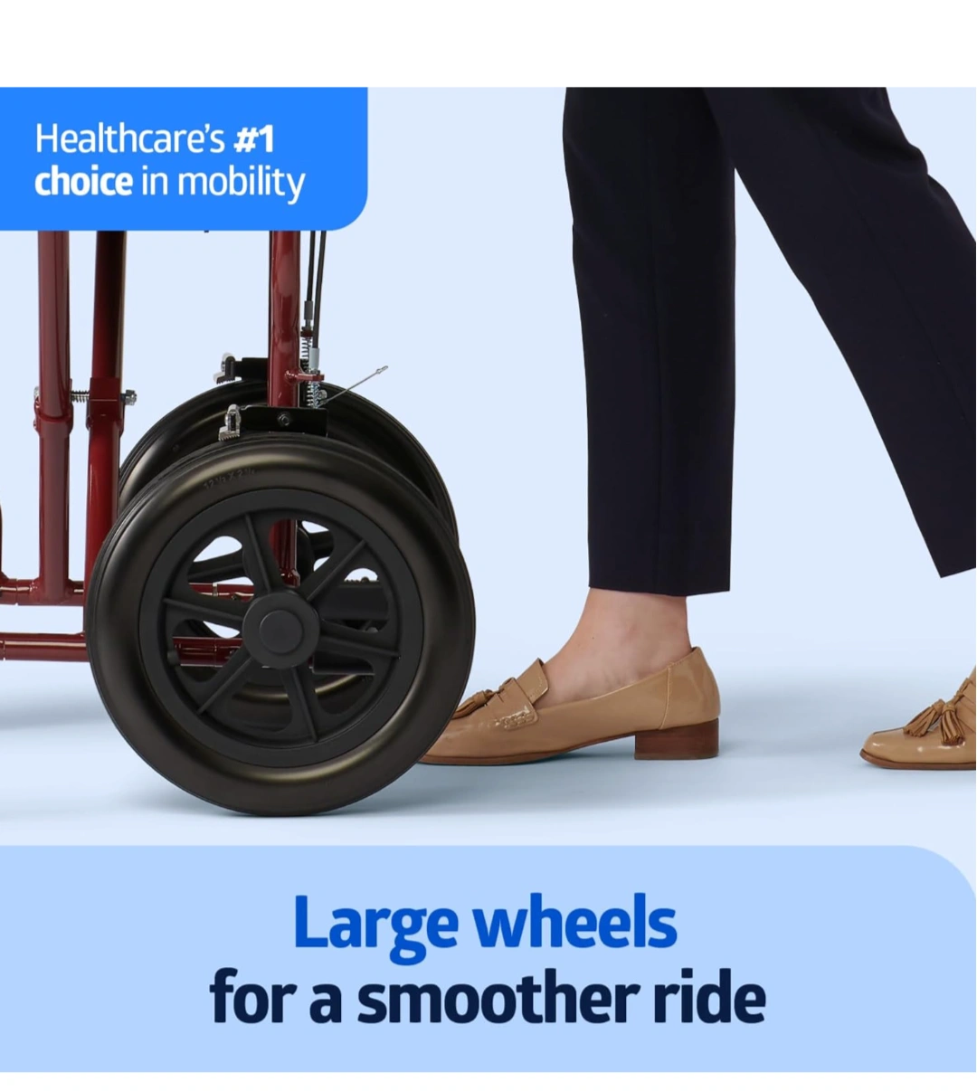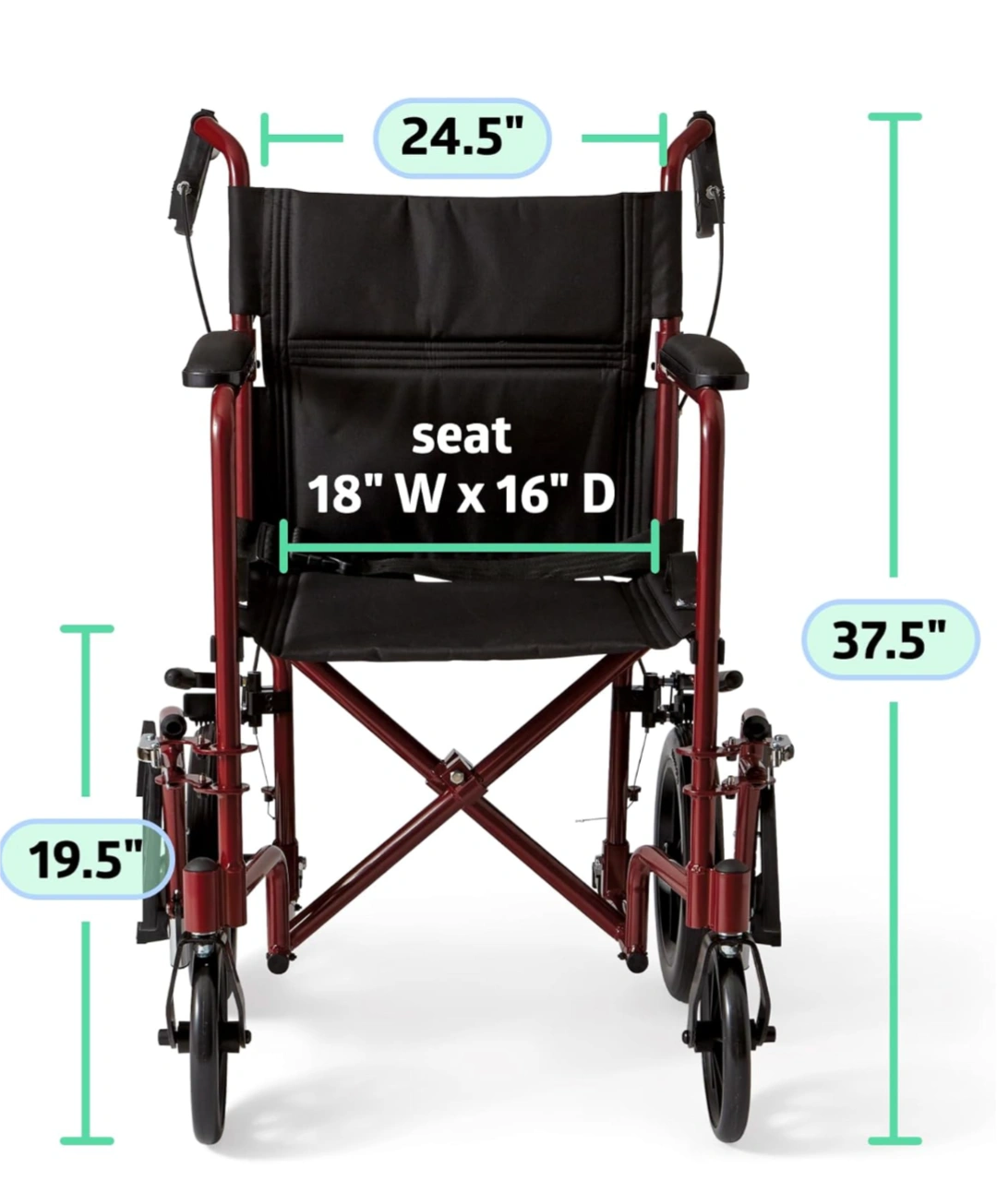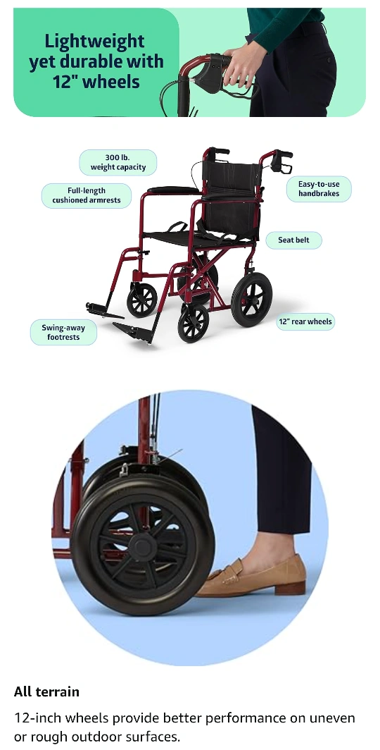 Selling a lightweight transport wheelchair in burgundy. It features: