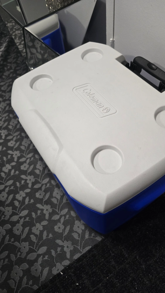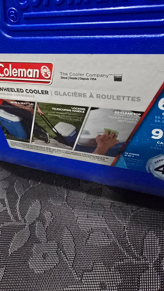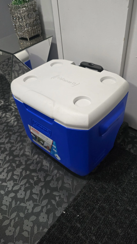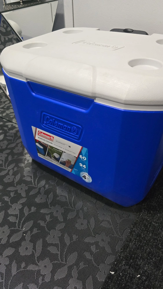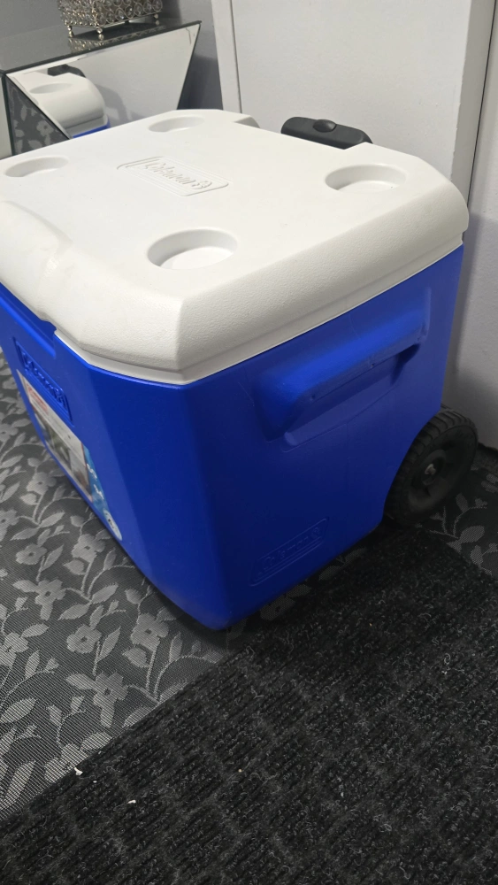 35Selling a Coleman 60 quart wheeled cooler! It's blue and white, and can hold up to 94 cans. It also keeps ice for up to 4 days
