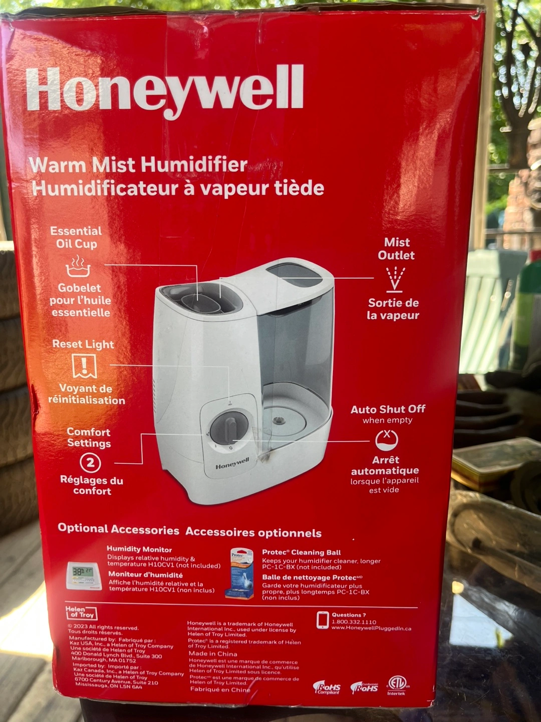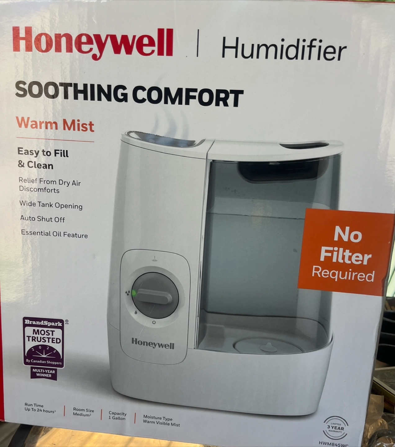 58Selling a Honeywell Warm Mist Humidifier in excellent condition! It's easy to fill and clean, and provides relief from dry air discomfort. It features a wide tank opening, auto shut off, and an essential oil feature. No filter required! Comes with the original box.