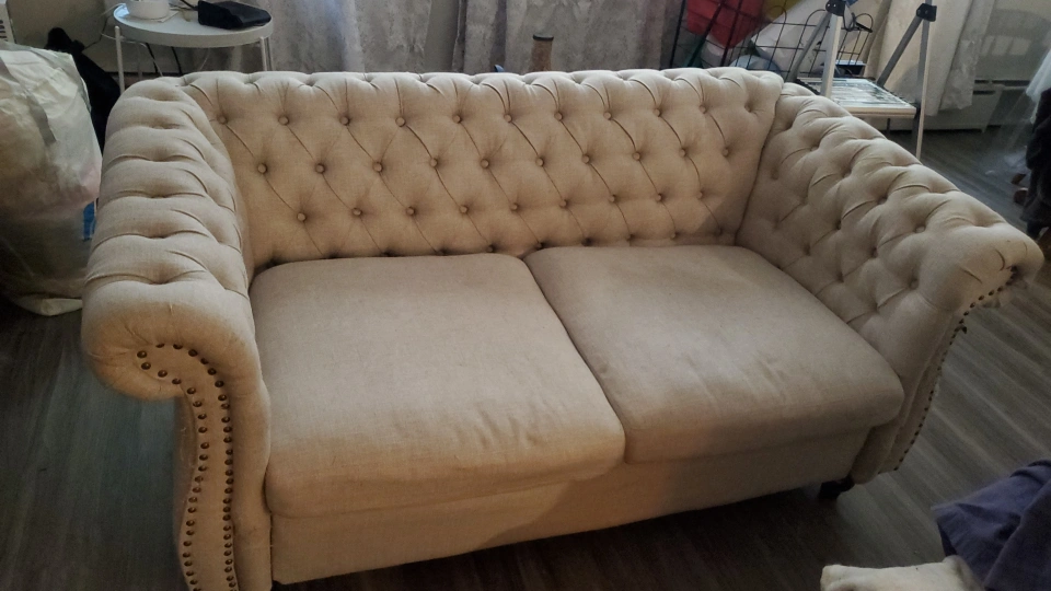 Selling a loveseat sofa in beige. It's in good condition and would be a great addition to any living room or small space! It features a classic tufted design with nailhead trim.