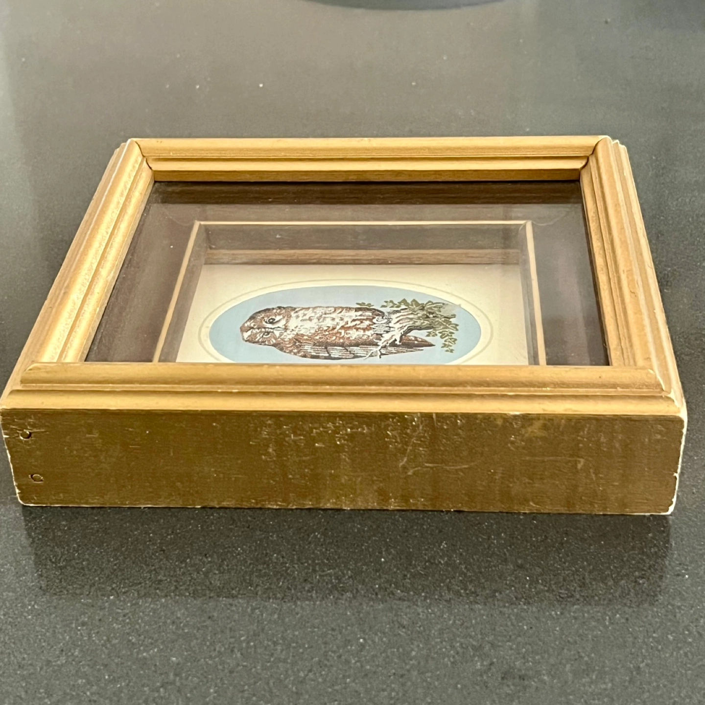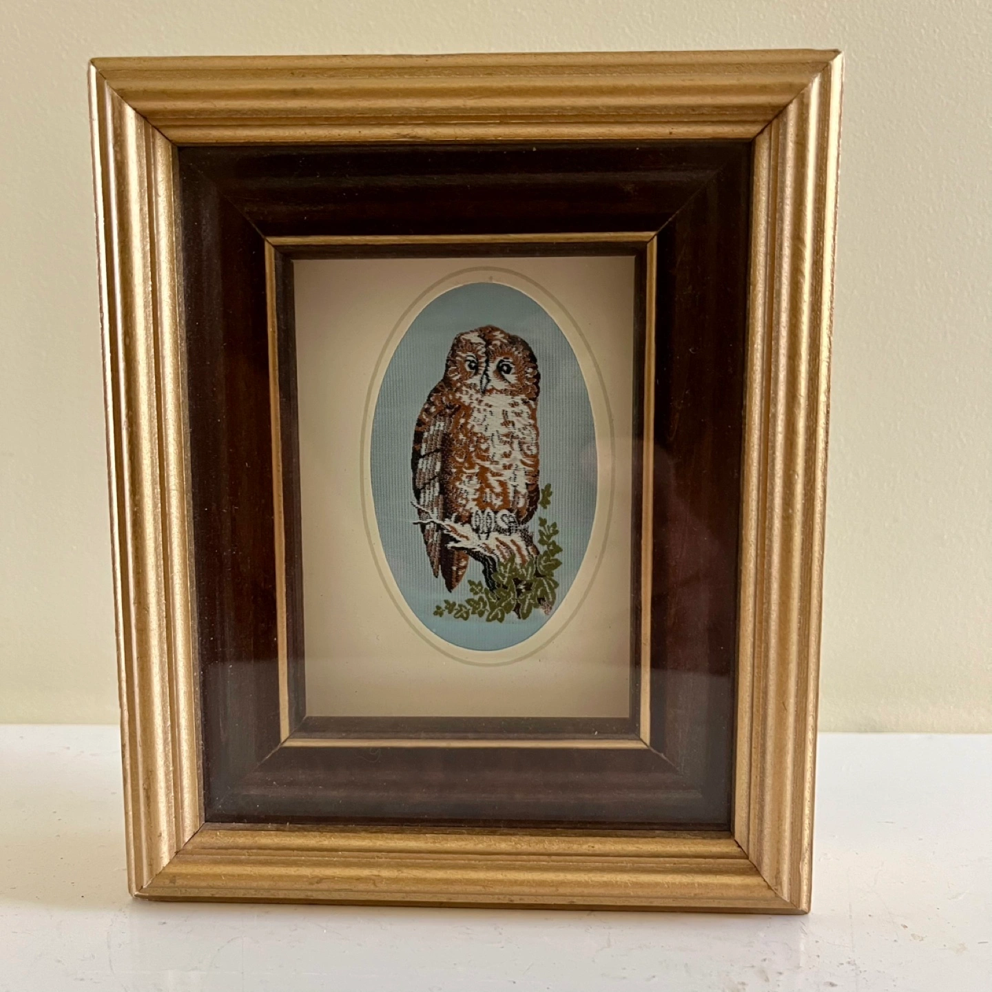 Charming Cash’s double-framed silk woven picture of a tawny owl in good condition, showing some wear on the frame that adds to its vintage appeal. Measures 6.5”H x 5.5”W x 1.5” D. Pictures like this were made in the 19th and 20th centuries by companies like Cash’s.
