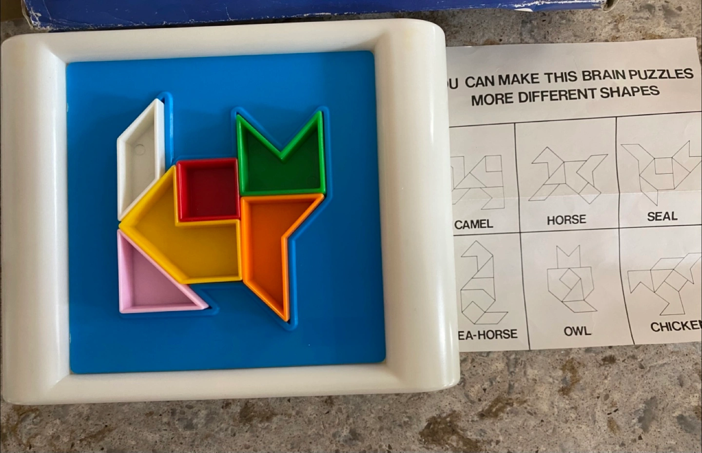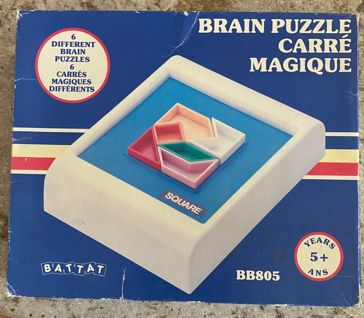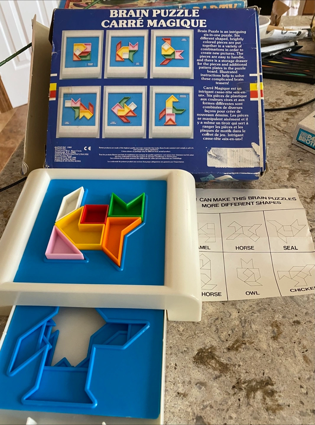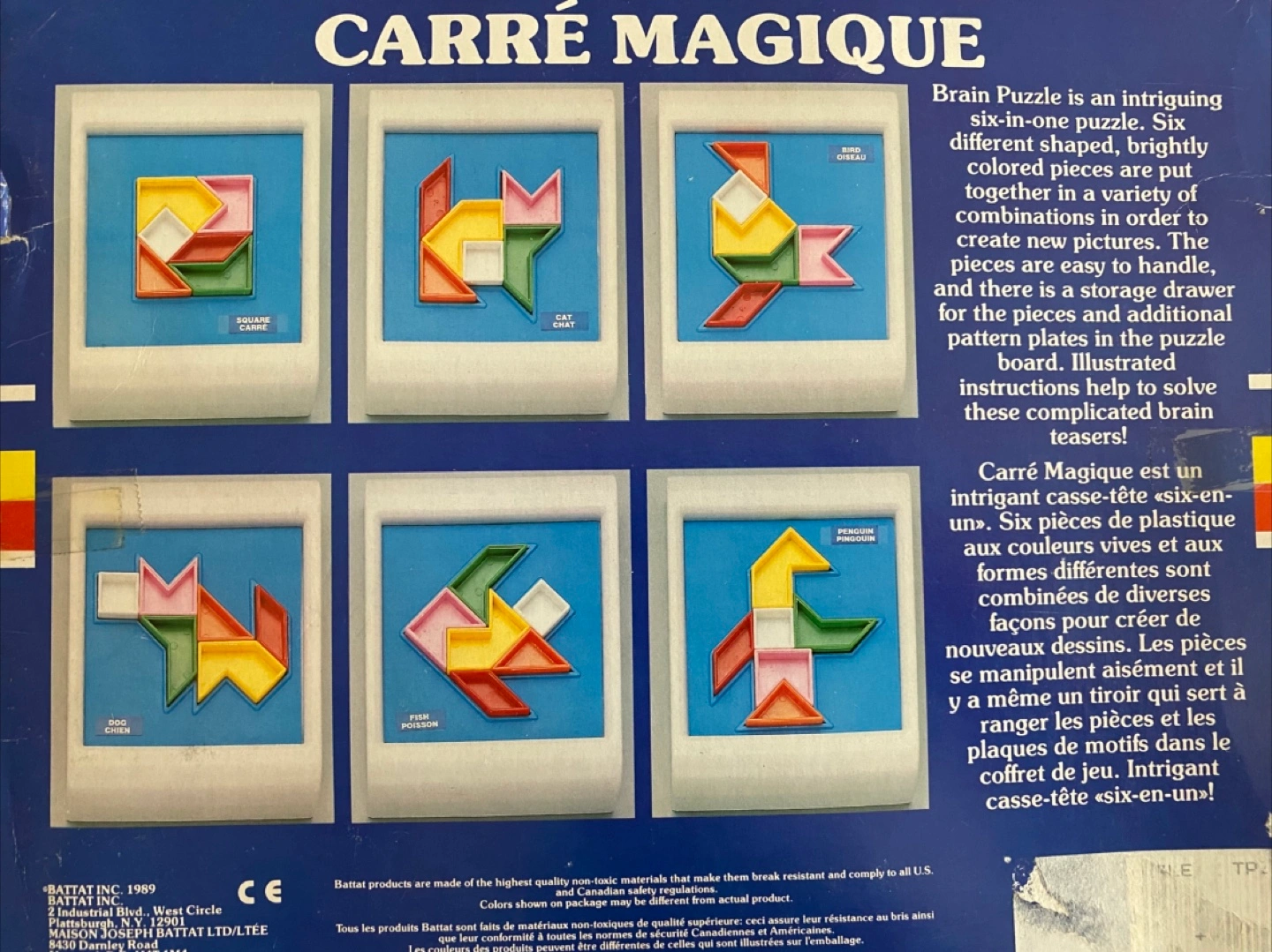 Selling a Battat Brain Puzzle Carré Magique! It's a brain puzzle with six different shapes that can be arranged in a variety of combinations to create new pictures. The pieces are easy to handle, and there's a storage drawer for the pieces and additional pattern plates in the puzzle board. Illustrated instructions help to solve these complicated brain teasers! Recommended for ages 5+