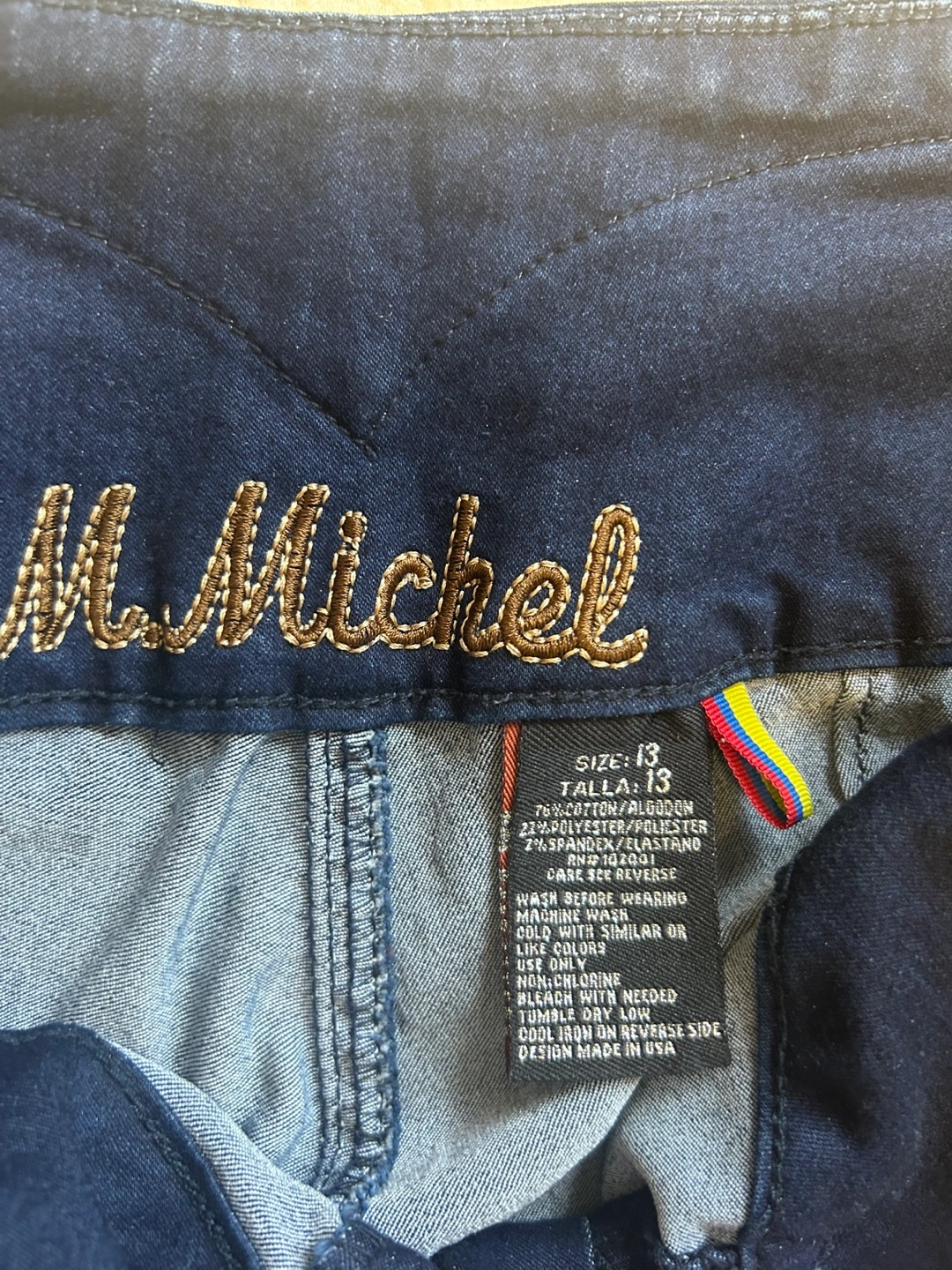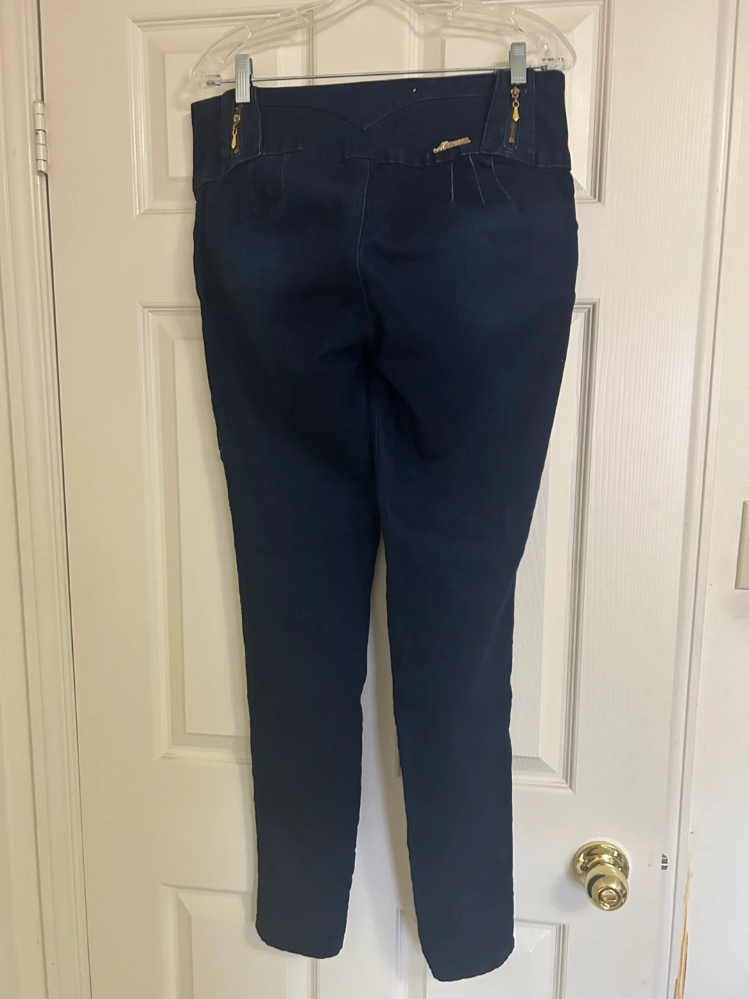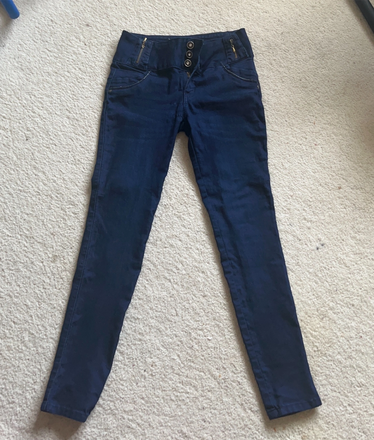 These are a pair of dark blue, high-waisted jeans. They have a unique button and zipper detail at the waist. They have never been worn because I gained a little weight after I got them and then they didn’t fit me.
