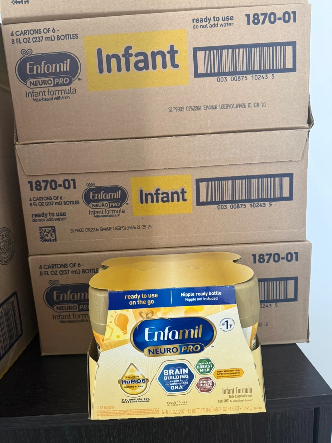 Ready-to-use infant formula. Each bottle contains 8 Fl Oz (237 mL). This Enfamil Neuro Pro formula is milk-based with iron and designed for brain building DHA. Includes 4 cartons of 6 bottles each, totaling 24 bottles.